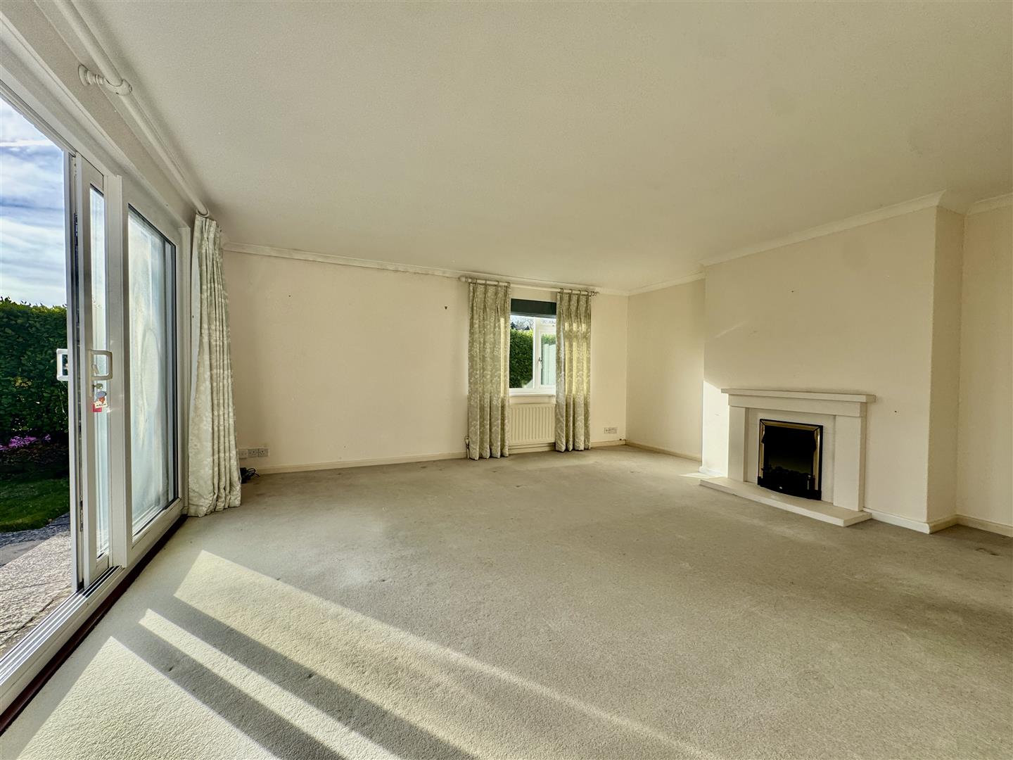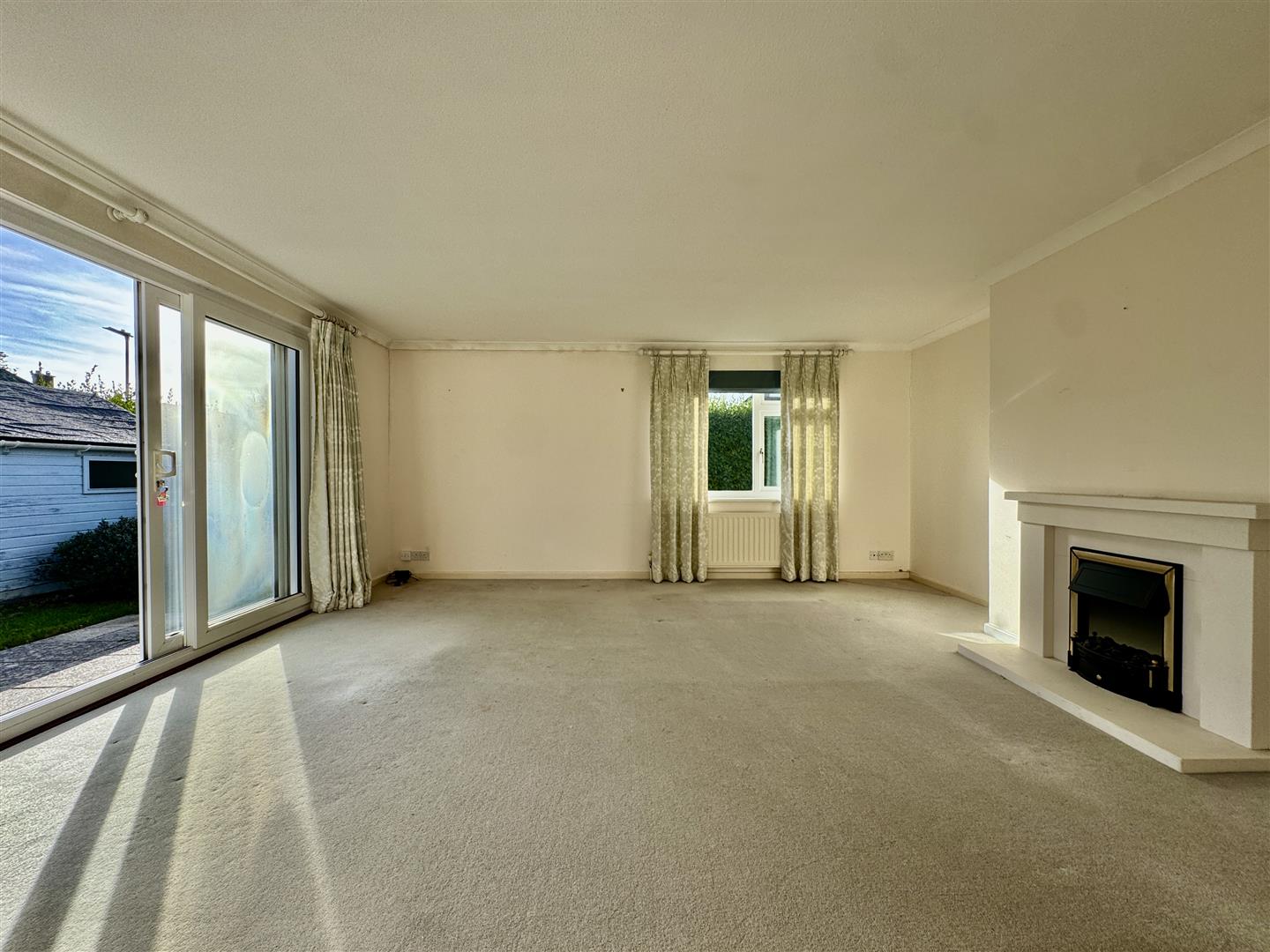 A spacious room with excellent proportions, featuring an electric fire within a stone fireplace, dual-aspect windows, and sliding patio doors overlooking the garden.