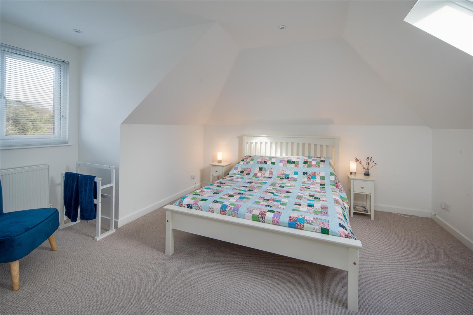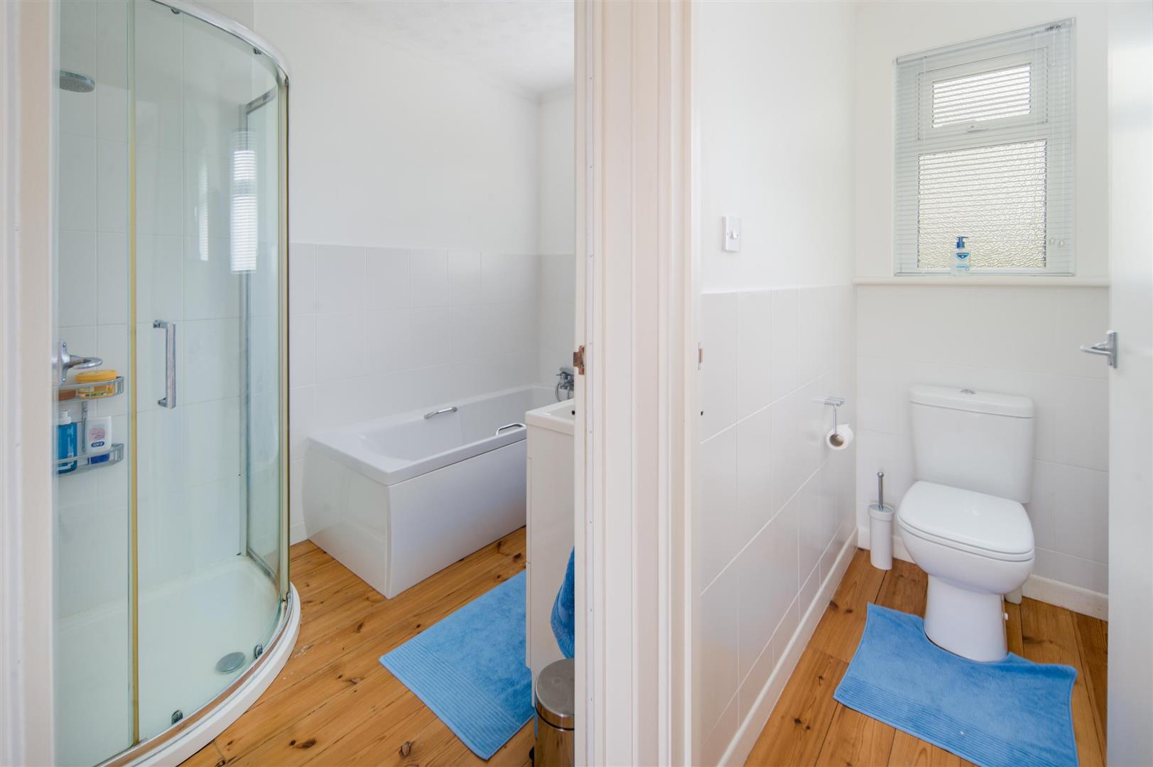 Carpeted stairs lead to a light-filled galleried landing with an airing cupboard including a clothes rail. The converted first-floor loft features two excellent double bedrooms, both benefiting from ample under-eave cupboard storage. The first floor also includes a bath/shower room with a shower, vanity unit, wash basin, heated towel rail, bath, and W.C.