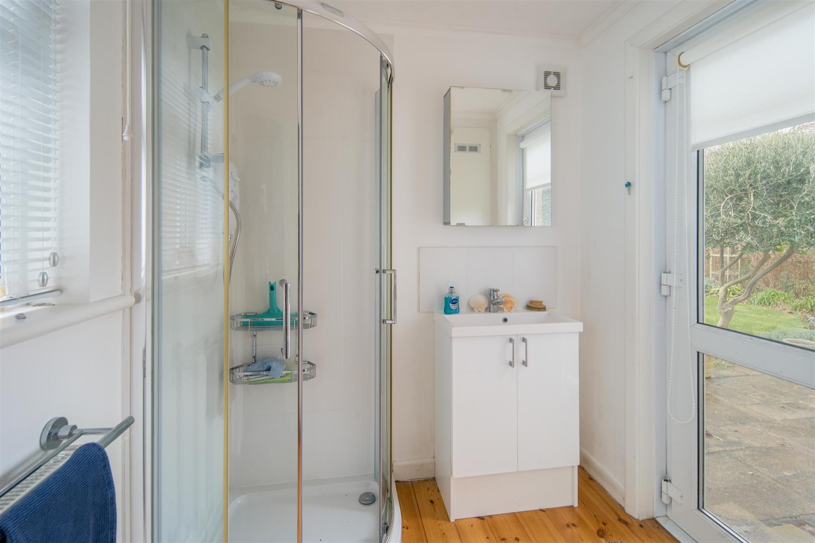 A versatile space with access to the rear garden, cupboard storage, a vanity unit with wash basin, and a shower with a power shower system.