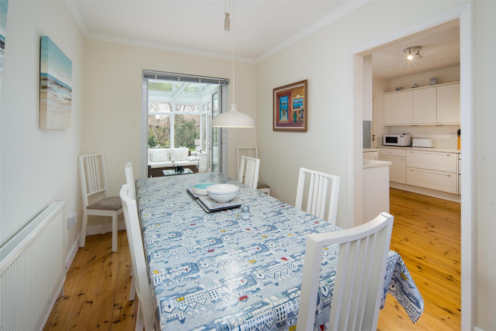 Semi-open plan to the sitting room, providing ample space for a dining table, with views through the conservatory to the garden.