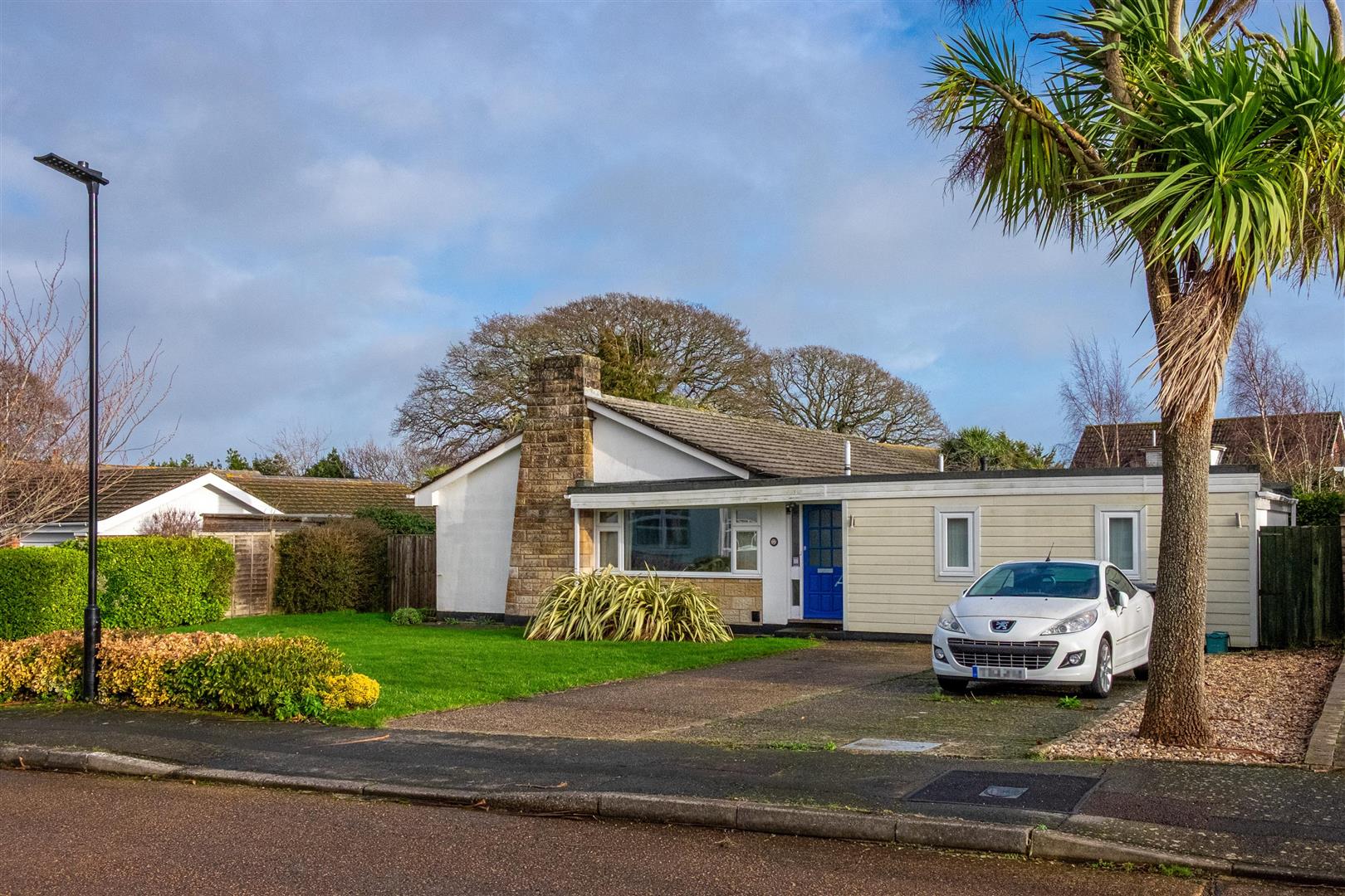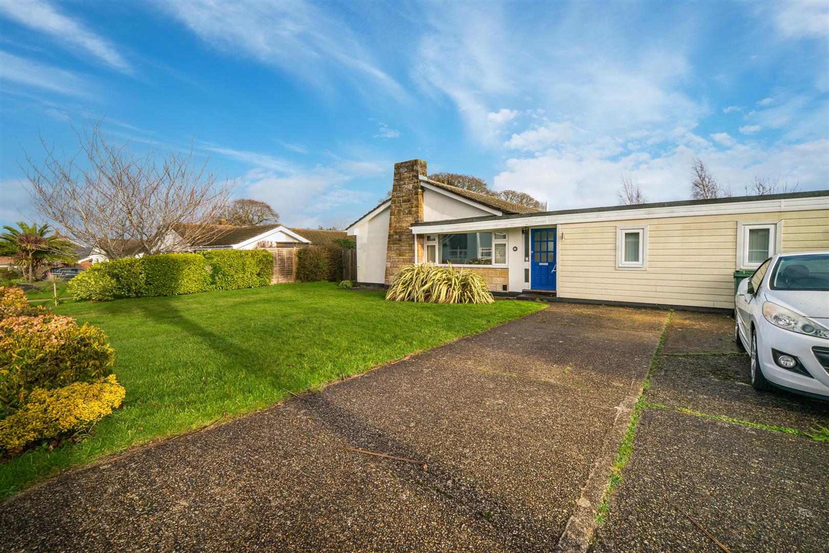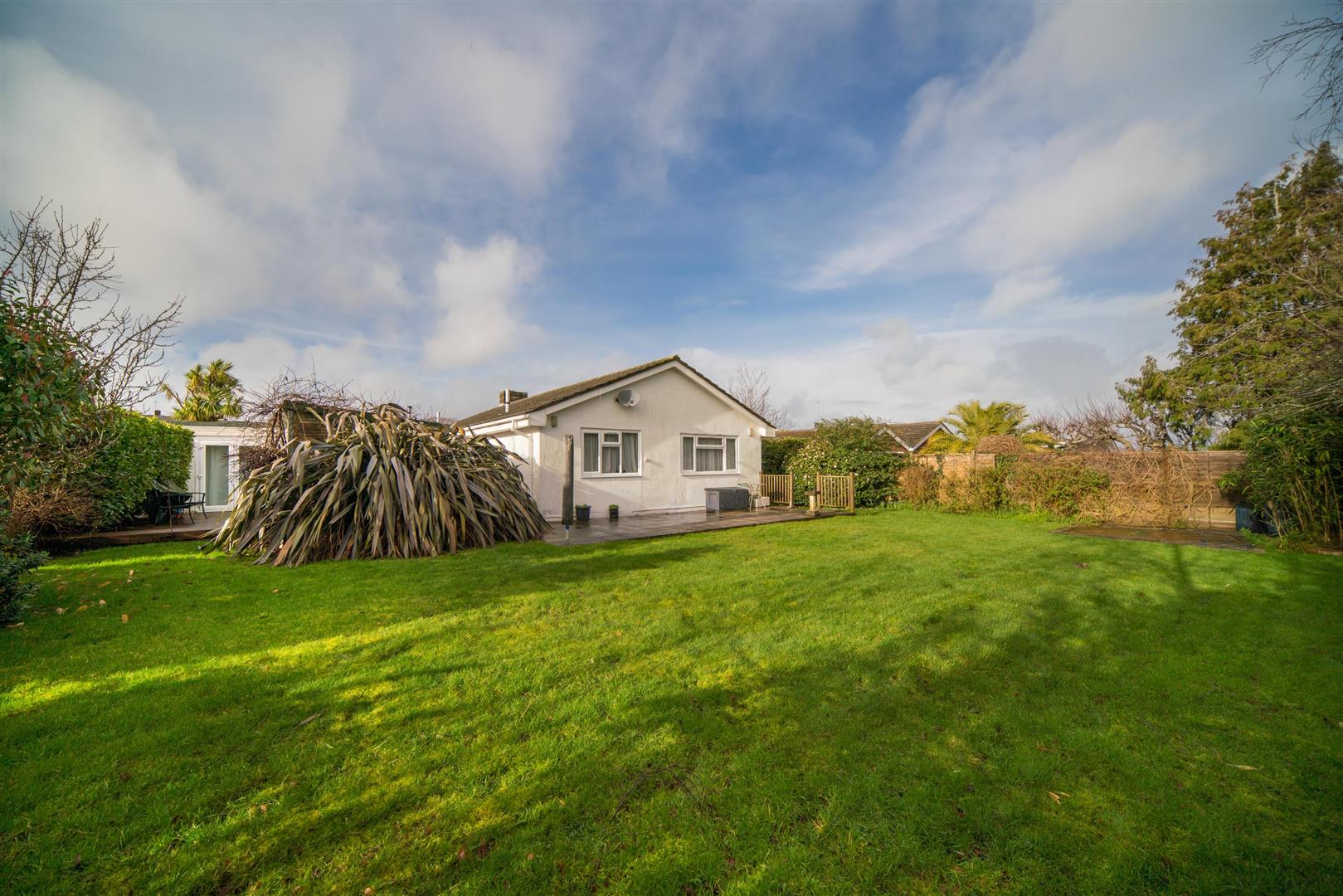 The bungalow occupies a substantial plot with ample off-road parking to the front and vehicle-width access to the rear. The garden enjoys a favourable south-easterly aspect and is predominantly laid to lawn, with mature shrubs and specimen trees providing excellent privacy. Planting includes Portuguese laurel, silver birch, cherry and bamboo.