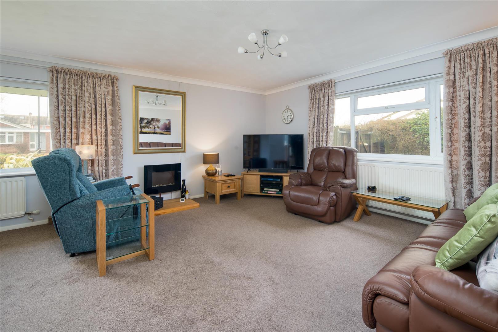 A bright and spacious dual-aspect living room with windows to both front and side, providing excellent natural light throughout the day. A wall-mounted electric flame-effect heater forms a focal point, with ample space for both seating and dining if required.