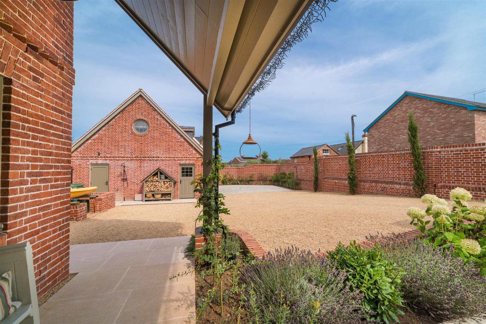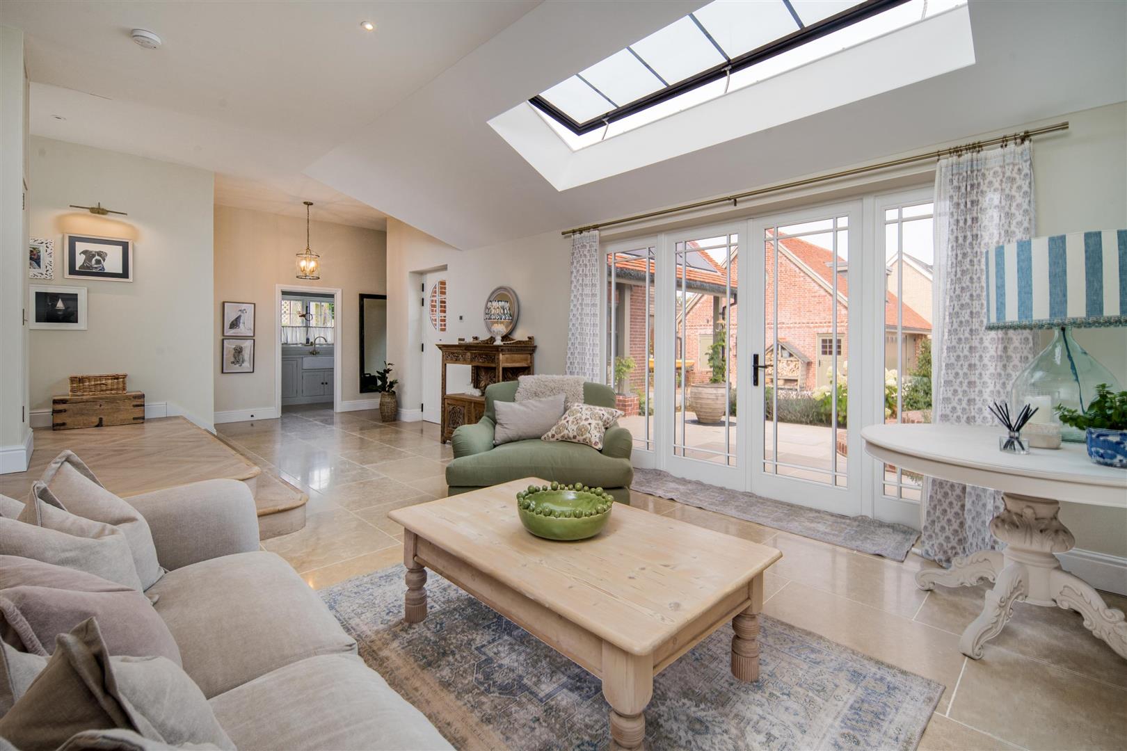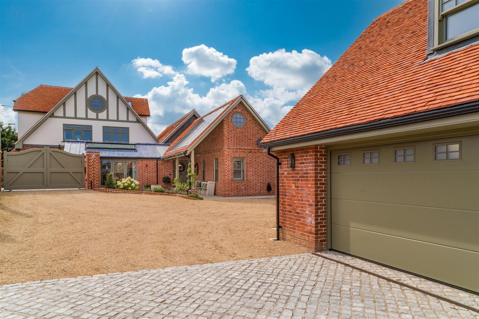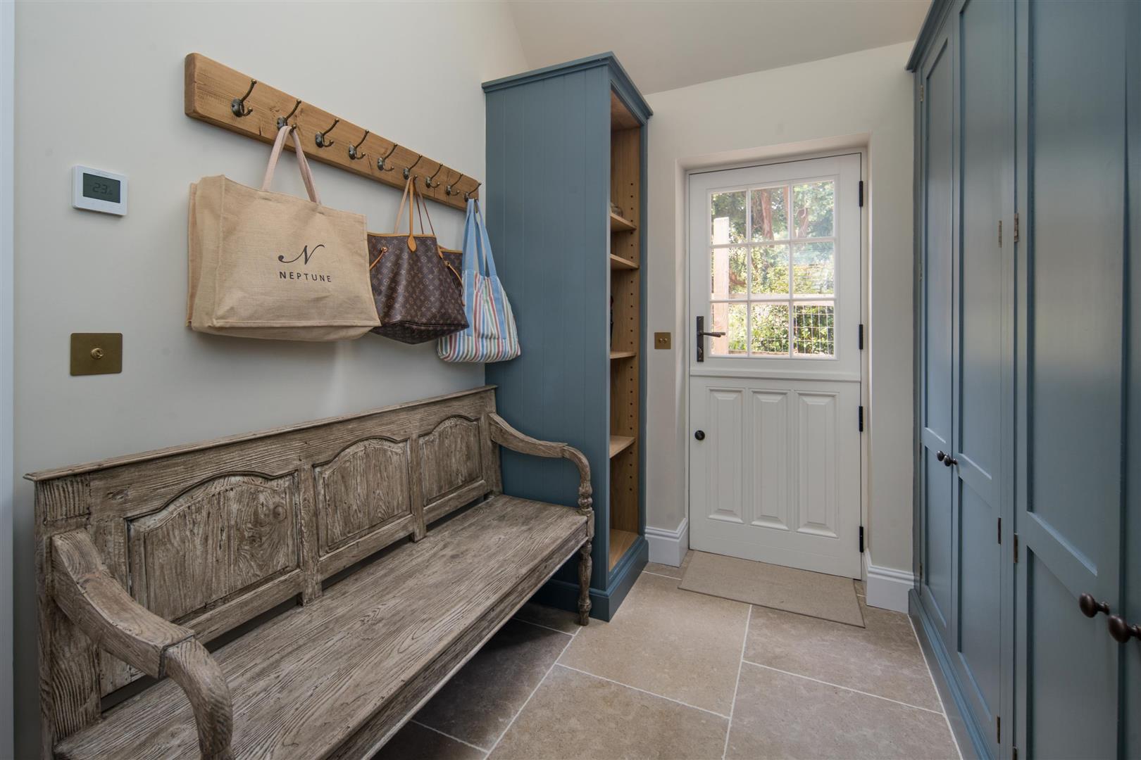 Approached through automated hardwood gates, the front walled courtyard is thoughtfully hard landscaped with granite setts edged in cobbles, limestone paths and structured planting; pleached apple and pear with Italian cypress for vertical rhythm. There is an outdoor shower and power provisioned Robinsons Ranby greenhouse on a brick plinth.