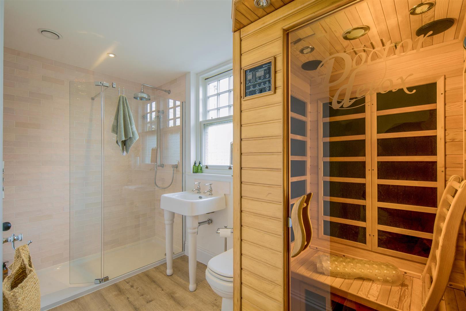 On the first floor, a guest double bedroom enjoys sea glimpses, a well appointed ensuite incorporating an infrared sauna ideal for post sail or water sport unwinding. Two further well-proportioned double bedrooms occupy the split level floor and share a substantial Family Bathroom with separate shower and a huge bath. All sanitaryware and brassware are by Booth & Co, with tasteful tiling and high quality finishes throughout.