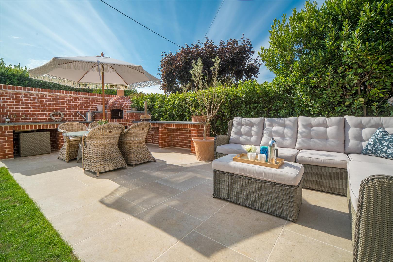 The south west facing rear garden is designed for effortless entertaining. A broad tumbled limestone terrace flows from the house to a fully equipped outdoor kitchen incorporating slate worksurfaces, pizza oven, sink with hot and cold water, and a gas connection for a BBQ under festoons for evening ambience. A corten edged border frames a level lawn maintained by a Husqvarna auto mower for minimal upkeep. Privacy is enhanced by mature bay hedge boundaries.