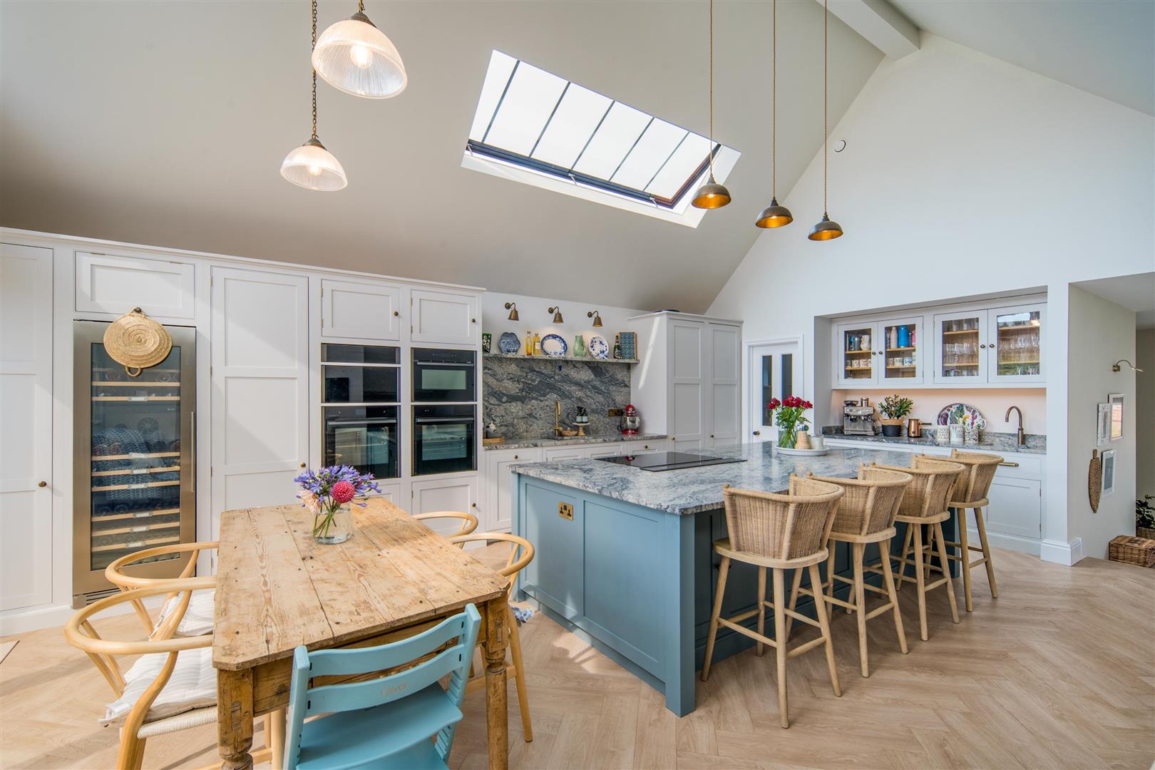 At the heart lies the vaulted Kitchen, boasting handmade timber cabinetry beneath solid Brazilian Piracema granite worktops and a striking vaulted ceiling with triple glazed opening skylight and bi-folding doors accessing the terrace. The kitchen is packed with premium appliances including Neff integrated double ovens and induction hob, microwave and downdraft extractor, twin Bosch integrated dishwashers. Built in Liebherr full height fridge and freezer with ice maker. A Quooker boiling hot, chilled and sparkling water tap and a walk in pantry.