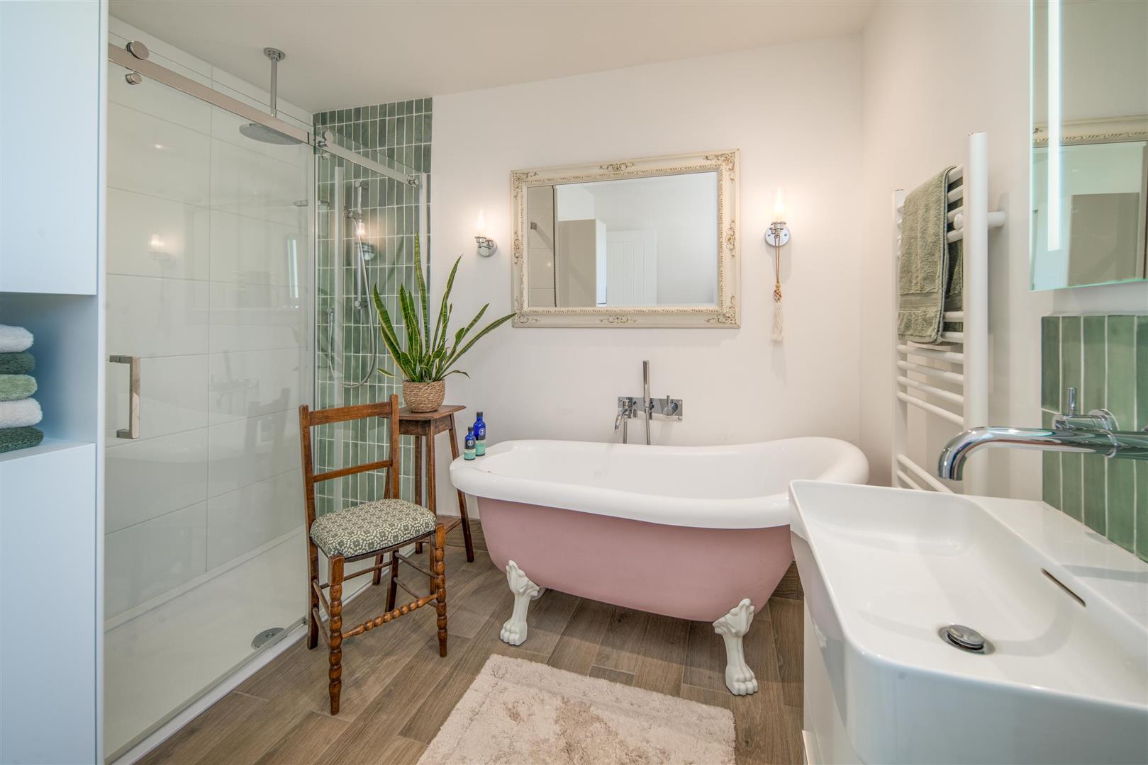 Offering the best of both worlds with a large double shower, a separate freestanding bath, a vanity unit with inset sink and a low-level WC. There is also a heated towel rail and window to the rear. Some built-in storage is also included.