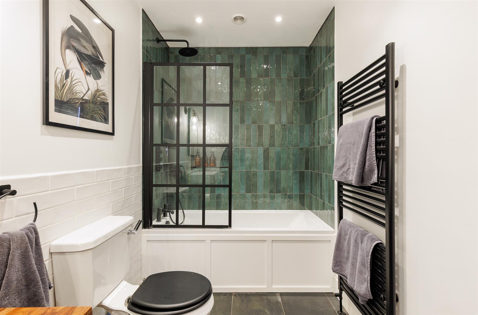 FAMILY BATHROOM WC, bath with rainfall shower with black-framed grid-style shower screen. Large rectangular vessel sink set on dark wood vanity unit with open shelving. Wall-mounted black taps, heated towel rail.