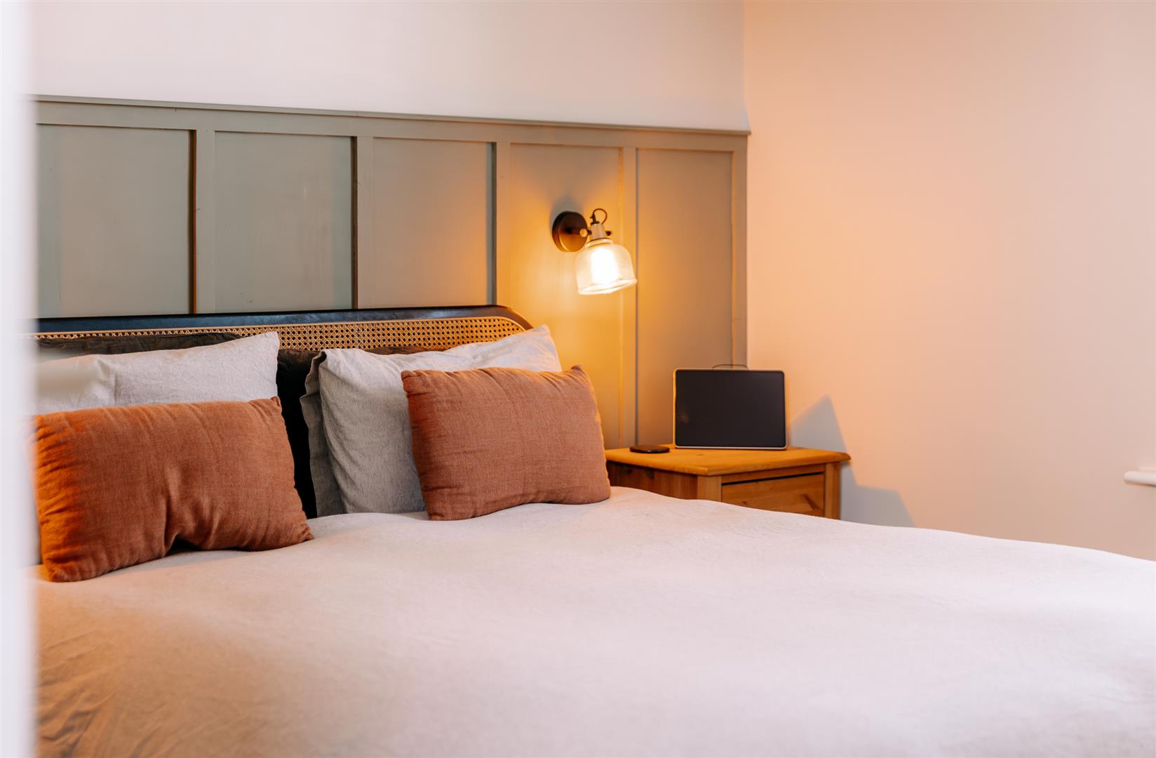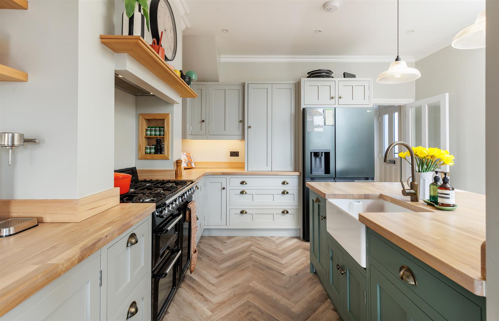 KITCHEN/DINING ROOM Triple aspect room featuring a bespoke shaker style kitchen with a wide range of cabinetry incorporating an Island with breakfast bar. Belfast sink with brass swan neck mixer tap. Integrated appliances including Smeg range cooker set within chimney breast with timber mantle over, American style fridge freezer and dishwasher. Wide archway through to DINING AREA with ample space for large table and French doors provide access to patio area. Herringbone oak-style flooring.
