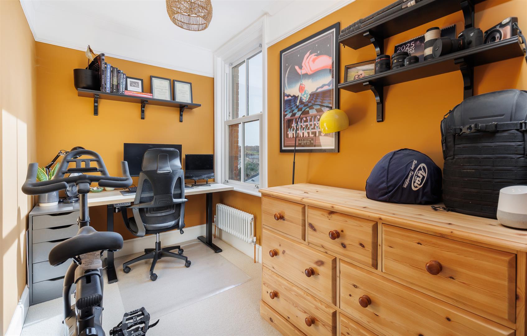 BEDROOM 3 Further bedroom currently utilised as a home office, black wall-mounted shelving.