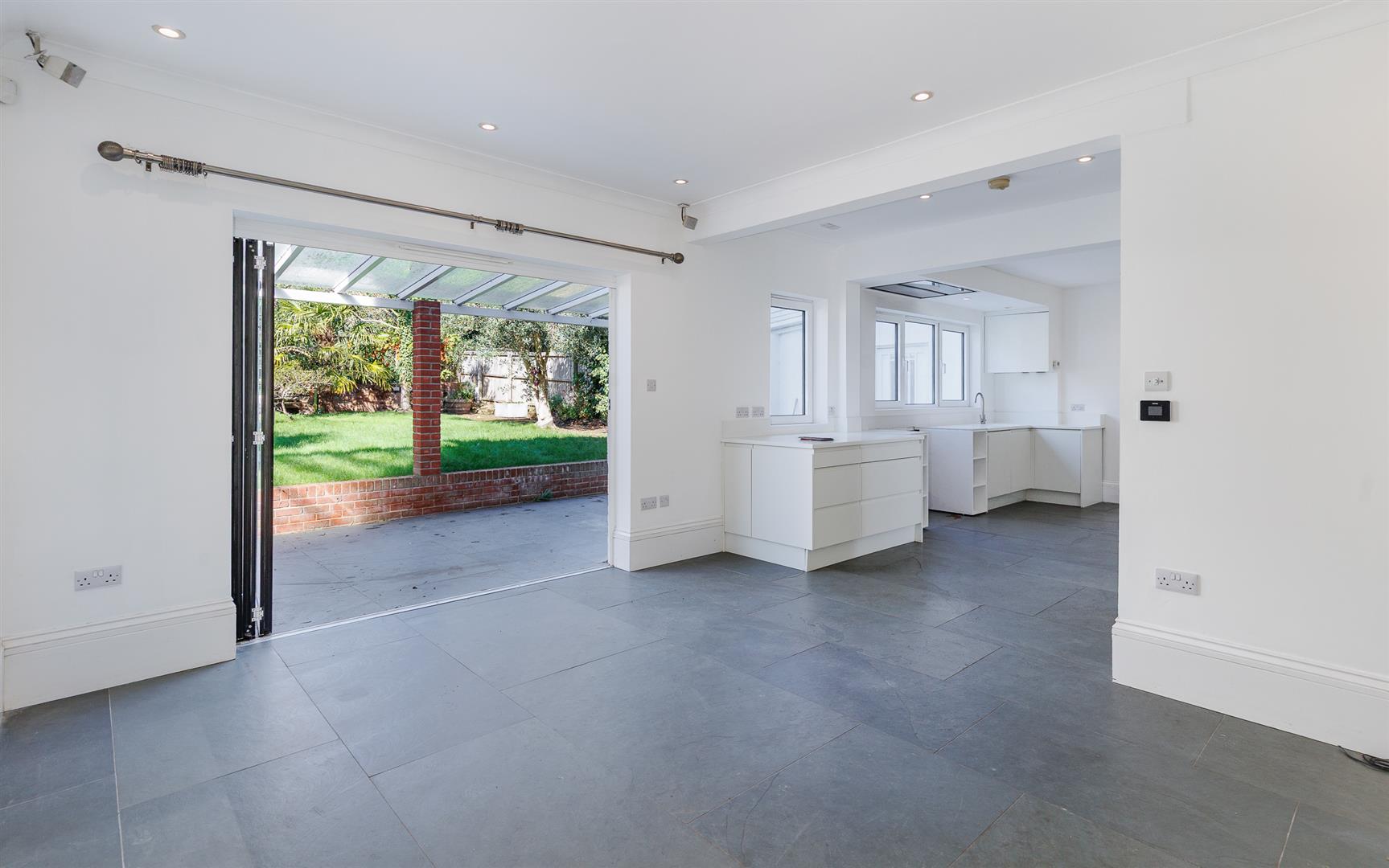 KITCHEN/DINING ROOM A spacious open-plan space ideal for entertainment, fitted with kitchen units with Corian worksurfaces and inset sink. Overhead extractor fan. Slate tiled flooring. The dining area has built in glass front cupboards either side of a sealed fireplace and large bi-fold doors providing an outlook over rear terrace and garden.