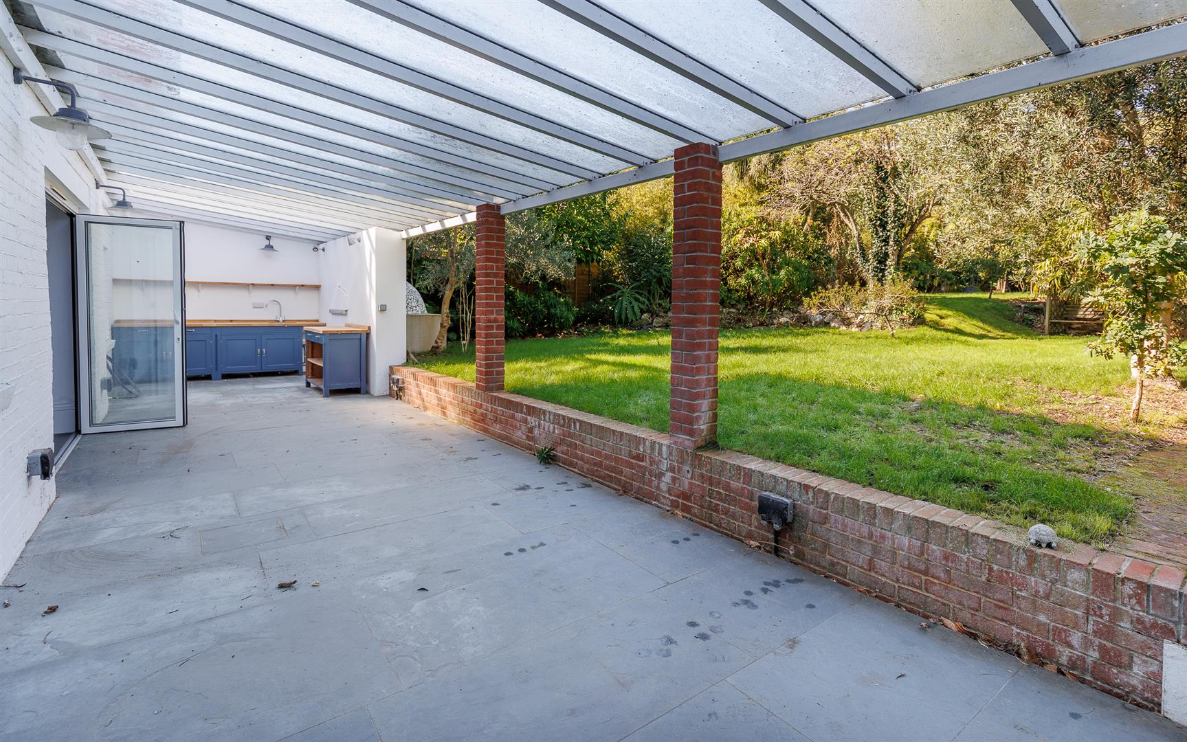 A path to the eastern side of the property leads to the rear garden. An extensive slate paved and covered terrace extending the full width of the house includes an OUTDOOR KITCHEN with base cupboards with timber worksurfaces. Wood fired PIZZA OVEN.