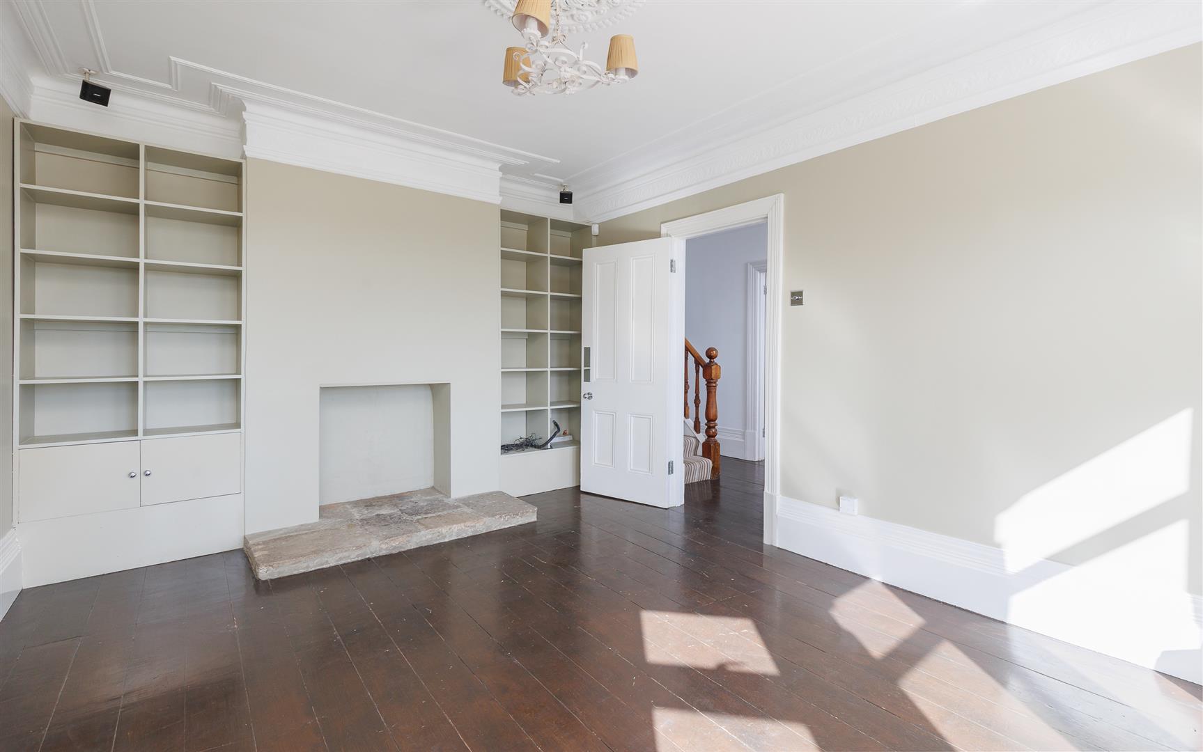 SITTING ROOM A particularly light room with large south east facing bay window spanning across the front façade. Decorative crown moulding and architraves on the ceiling. Sealed fireplace on a flagstone hearth with shelving and cupboards to alcoves either side.