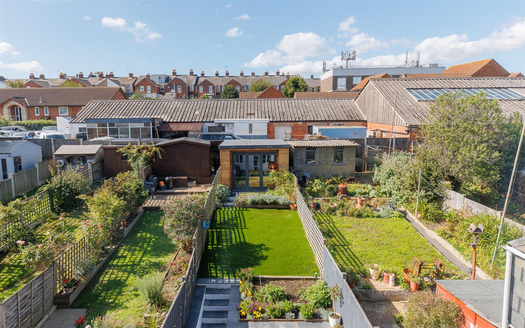 To the rear of the property is a garden enclosed by fencing and set out over terraces to maximise the space. A door opens from the dining area to a decked terrace with built-in bench seating and an outdoor sink (with both hot and cold running water) and power, a perfect space to enjoy alfresco dining. Steps from here lead passed some planted borders to an area laid to astroturf, beyond which is the HOME OFFICE/SUMMERHOUSE with power and lighting.