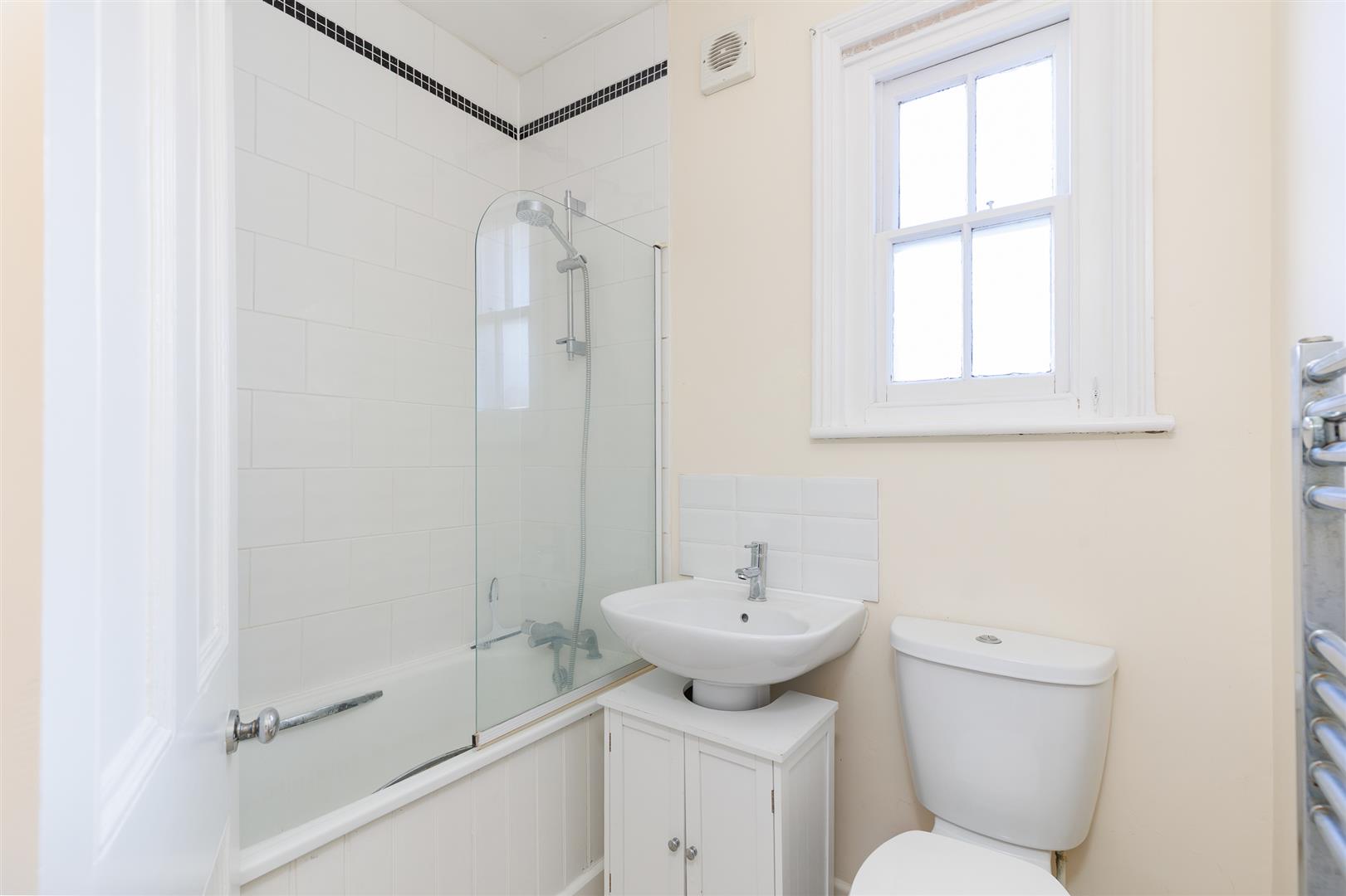 BATHROOM A family bathroom featuring bath with shower, sink with mixer tap and cabinet beneath, heated towel rail.