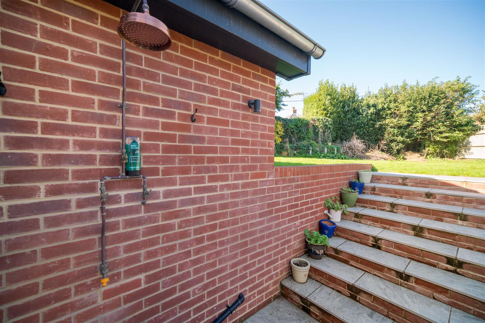 There are steps leading up from the substantial patio area to the rear garden area which is enclosed by fencing and mainly laid to lawn with a variety of plants and shrubs. The current owners have also added an outside shower for those who like kayaking, paddle boarding etc or have a dog that enjoys the many local walks and likes the puddles!
