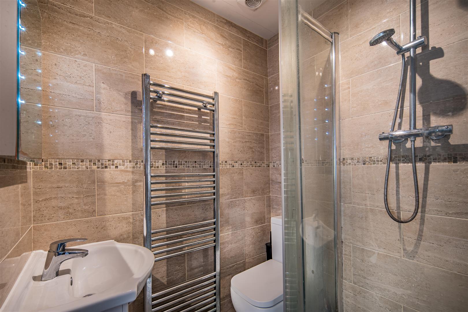 A spacious bathroom with suite comprising a vanity wash basin and bath with shower unit over and a WC. Obscure window to rear.