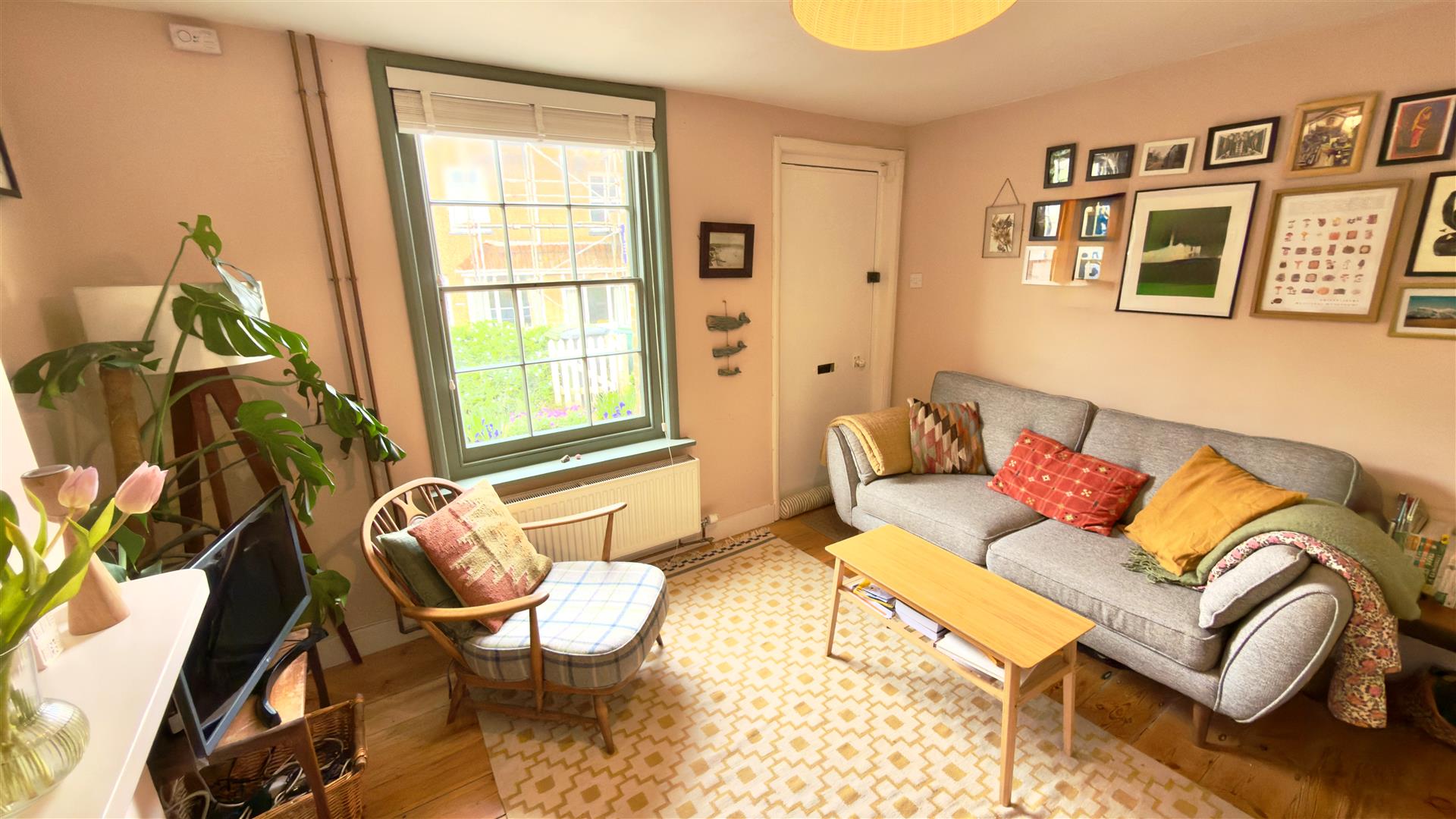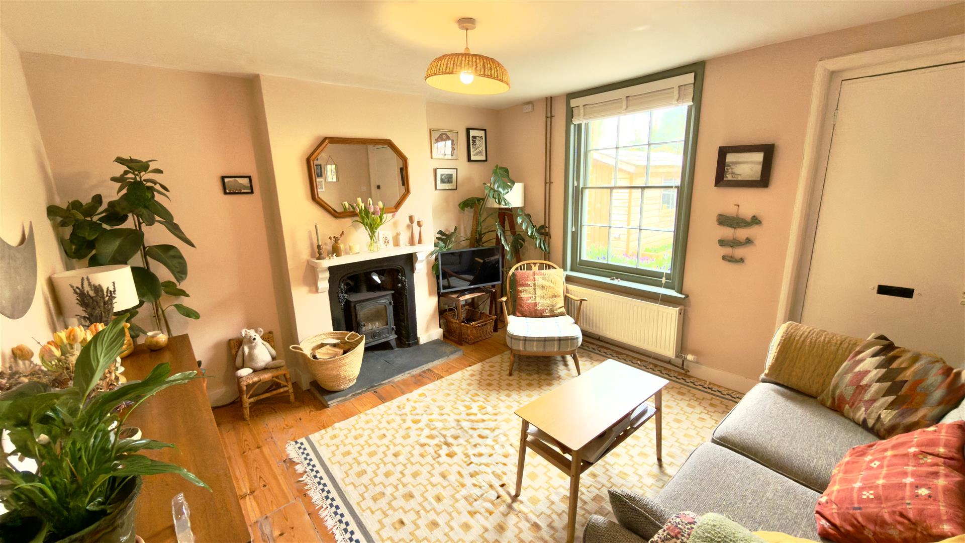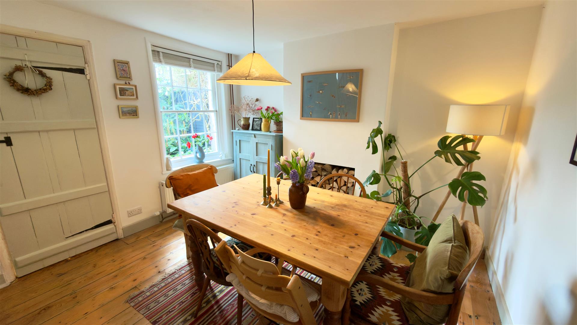 With exposed wooden floors, an ornate fireplace fitted with log burner, sash window to front garden and door to outside.