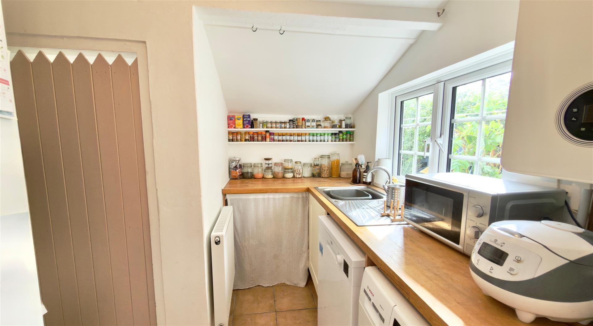 A bespoke kitchen with floor standing cupboard, complemented with a solid Oak work surface over. Integrated gas hob and electric oven, inset sink and drainer with window to side access and arch to: