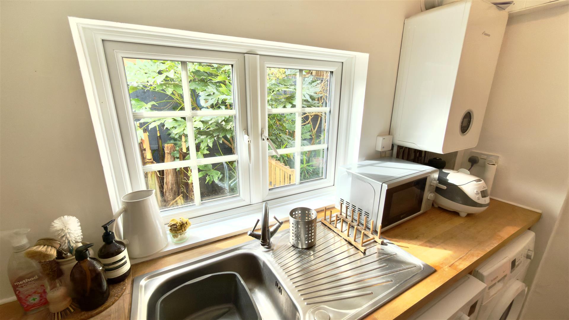 An ‘L’ shaped room which works well as a continuation of the kitchen with the same Oak work surface incorporating a stainless steel sink and cupboard under. Window to side aspect.There is plumbing and space for both a dishwasher and a washing machine and a wall mounted gas boiler. Door off to separate WC.