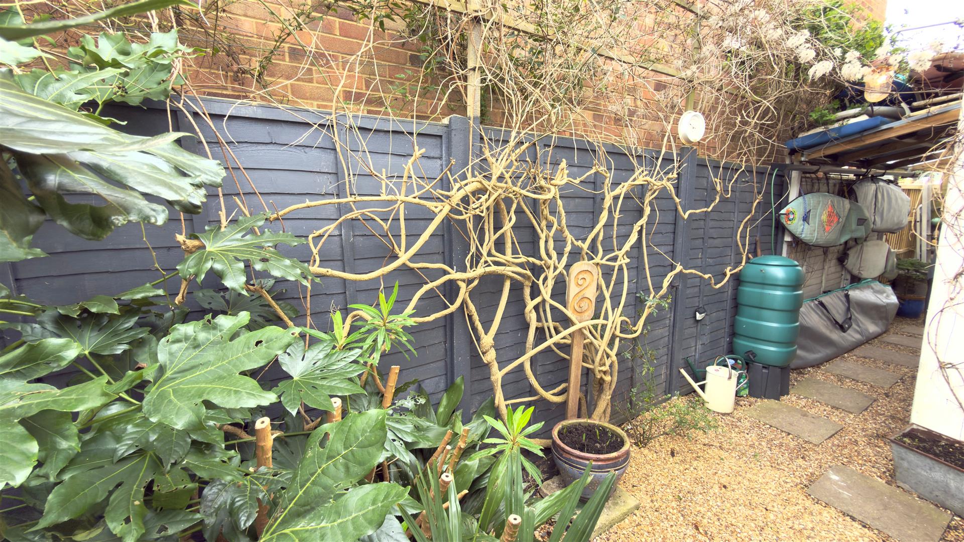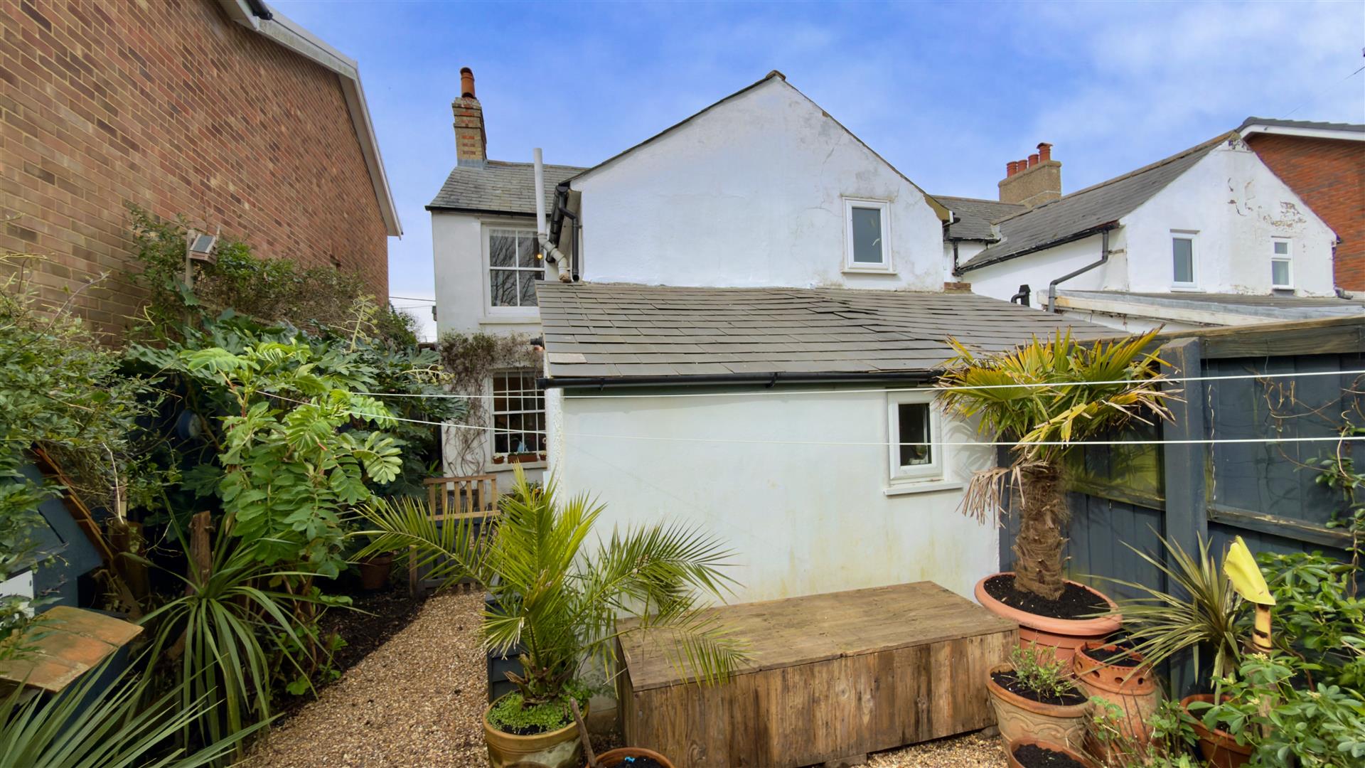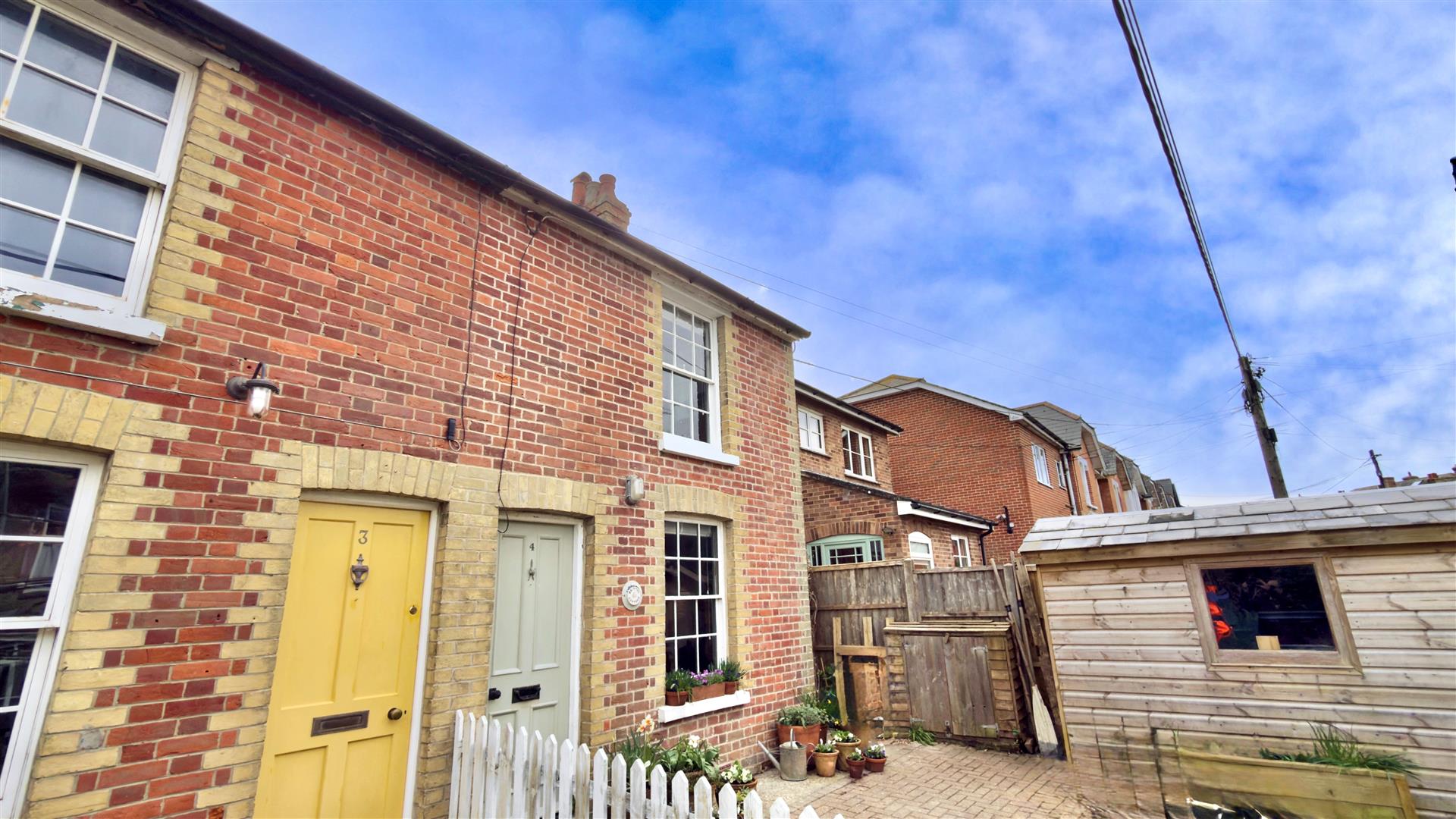 To the front is a paved courtyard area bordered with deep flower beds and a white picket fence and includes a wood built shed. A gated side path leads to the side and sunny rear garden which is fenced and bordered with a variety planted shrubs and flower borders.