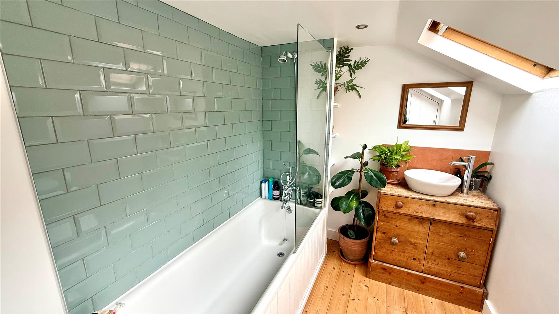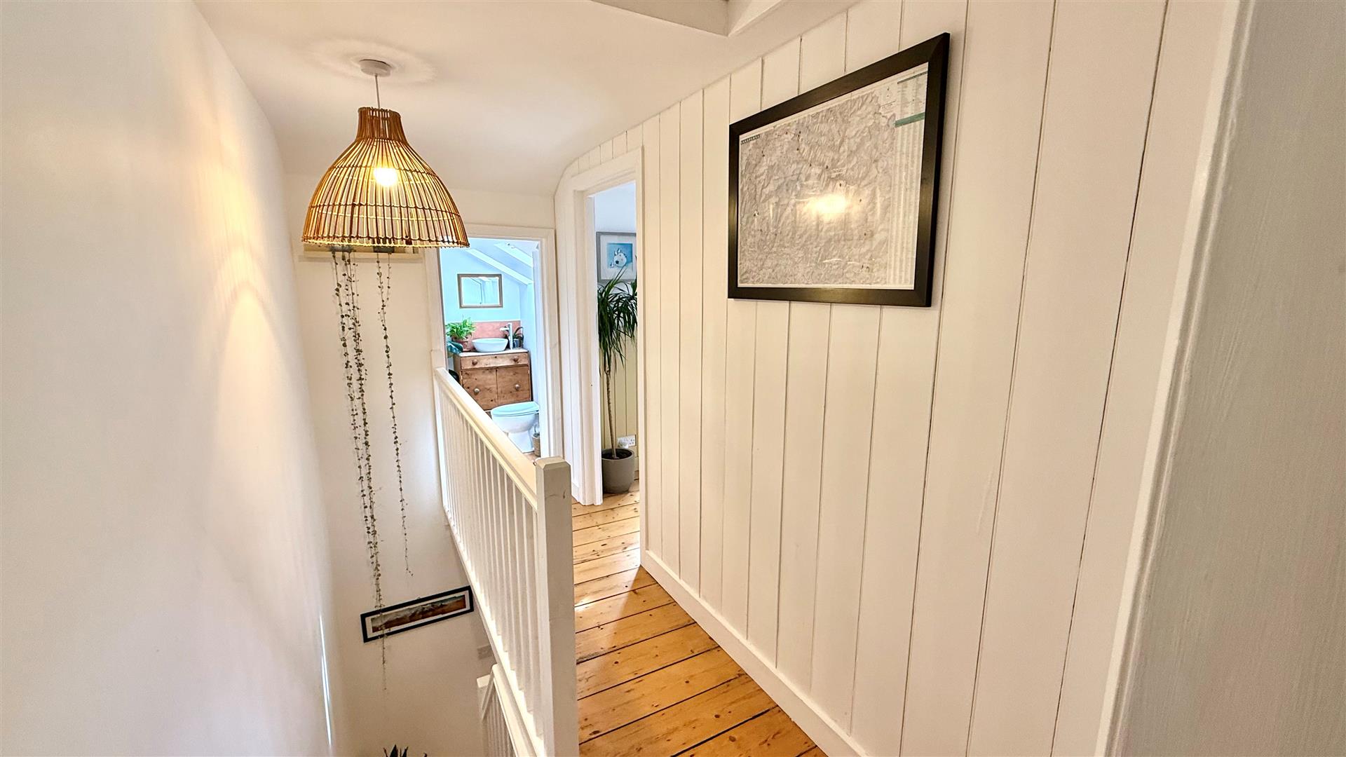 Two Velux windows provide an abundance of natural light and the bathroom comprises a bath, low level WC and a wash basin. There is also a built-in cupboard.