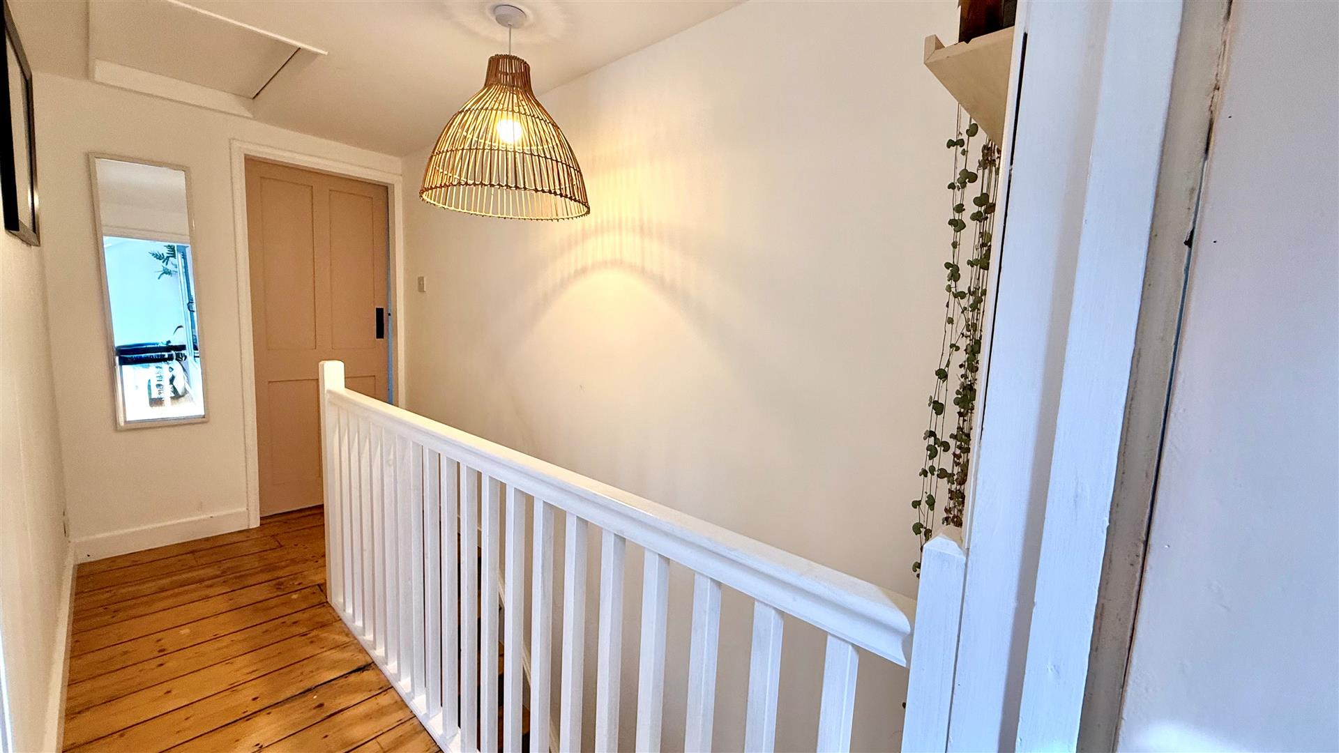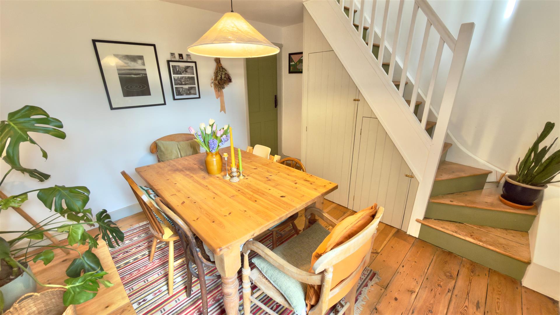 A charming dining room with sash window overlooking rear garden, chimney breast to install a log burner if required. and recently created understairs storage cupboard. Turned stairs to first floor and doors off to: