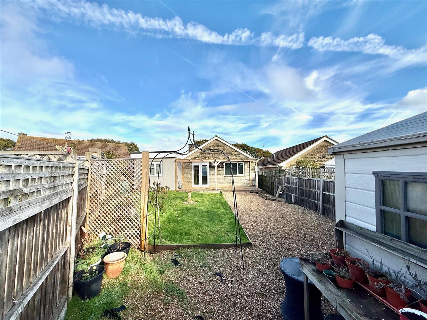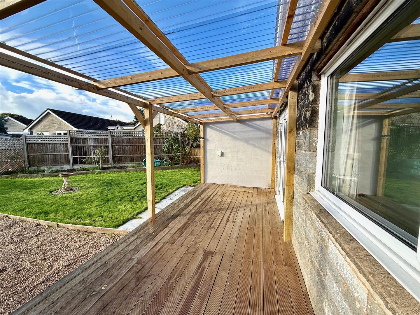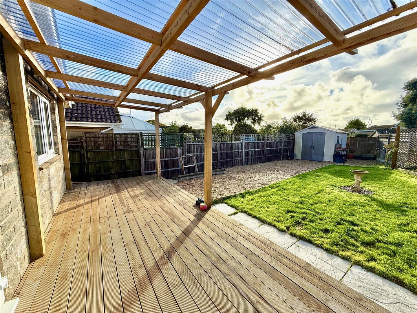 The front offers plenty of off-road parking on paved drive with low wall and some planted shrubs with access to the garage. Moving down the side of the property to the rear garden which has a generous open covered decked area with access to the kitchen, a good size rear garden with part gravel and lawned areas with wood fencing and a Keter storage shed.