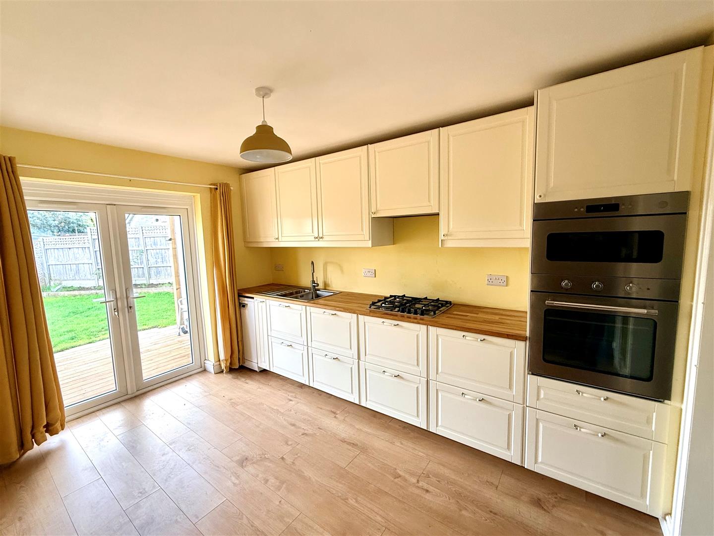 Recently installed with a range of wall and floor mounted units with ample worksurface space and inset sink and drainer. Integral appliances include a gas hob with extractor over and oven/grill/microwave. Double patio doors lead onto a large open covered decked area ideal for entertaining or just sitting and enjoying the rear garden.