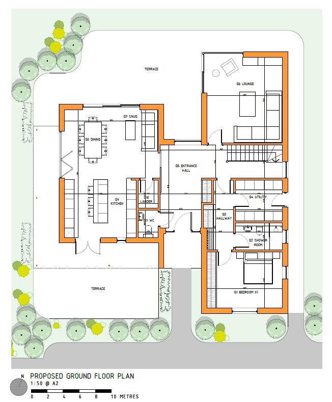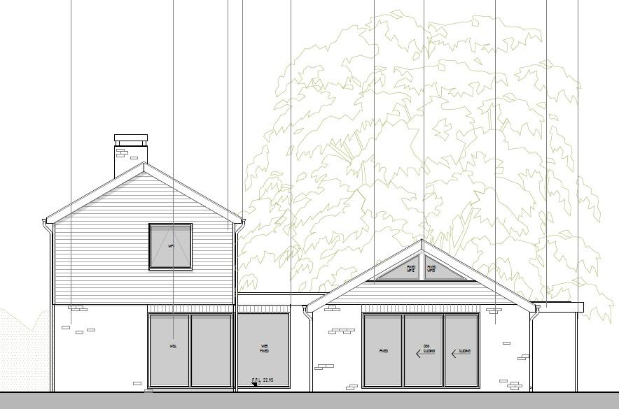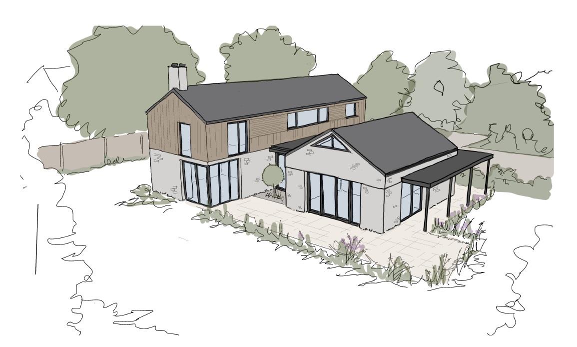 The current proposed dwelling encompasses a fusion of textures from generous amounts of glazing thoughtfully combined with a mixture of brickwork and vertical timber cladding creating a smart and striking appearance and as some works/conditions have already been completed and discharged the planning is permission should therefore not lapse. The accommodation is approximately 210 square metres and boasts a stunning open-plan kitchen and dining area with an adjoining snug. A walk-in larder enhances functionality, while a vaulted ceiling with a central glazed roof lantern floods the space with natural light. Cleverly designed, the room is connected to the two-storey section of the home via a glazed entrance hall link with cloakroom, and it offers seamless access to the gardens through doors leading to the front, side, and rear. The space also enjoys both front and side facing verandas, perfect for outdoor living and entertaining. Further ground floor accommodation comprises a separate lounge with a wonderful full height corner window to the rear as well as provision for a wood burning stove. A useful utility room and a double bedroom with shower room adjacent complete the ground floor space. The first floor is designed to accommodate a further three double bedrooms, one with an en suite shower room as well as a separate family bathroom.