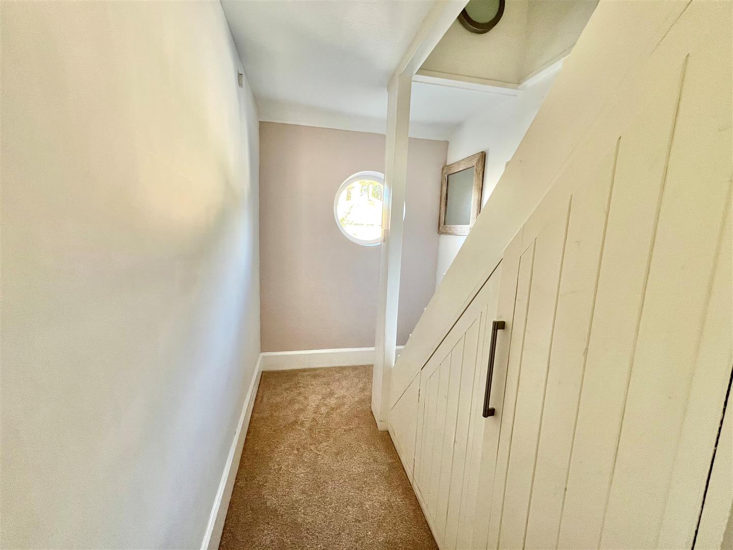A good sized landing area with some built-in storage, a window to the front, a feature “porthole’ window and a covered radiator. A wooden staircase leads up to second floor and there are doors off to: