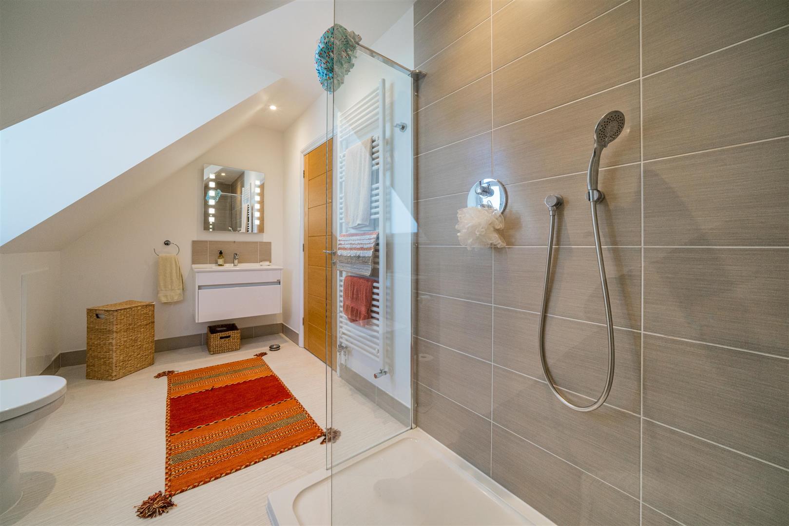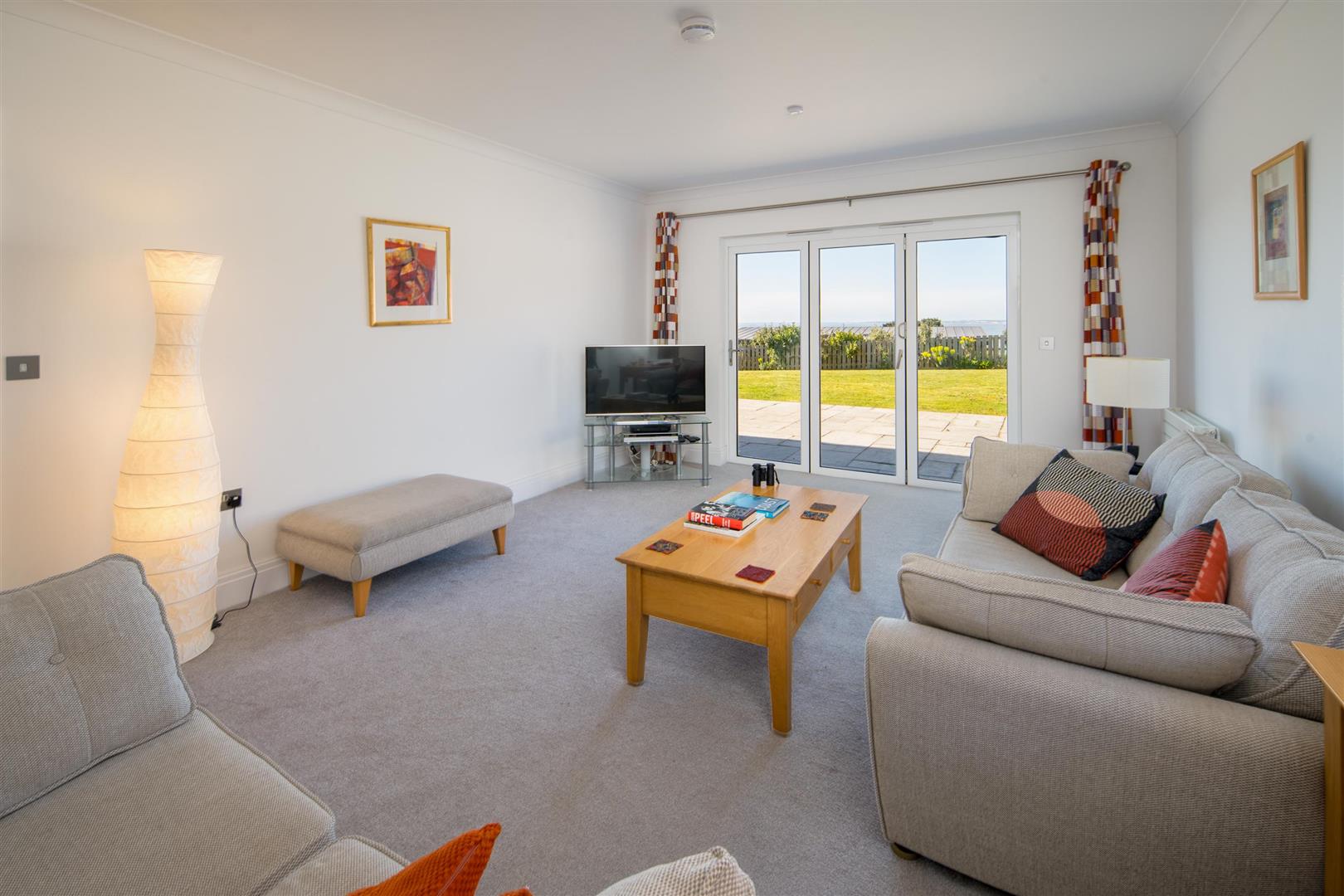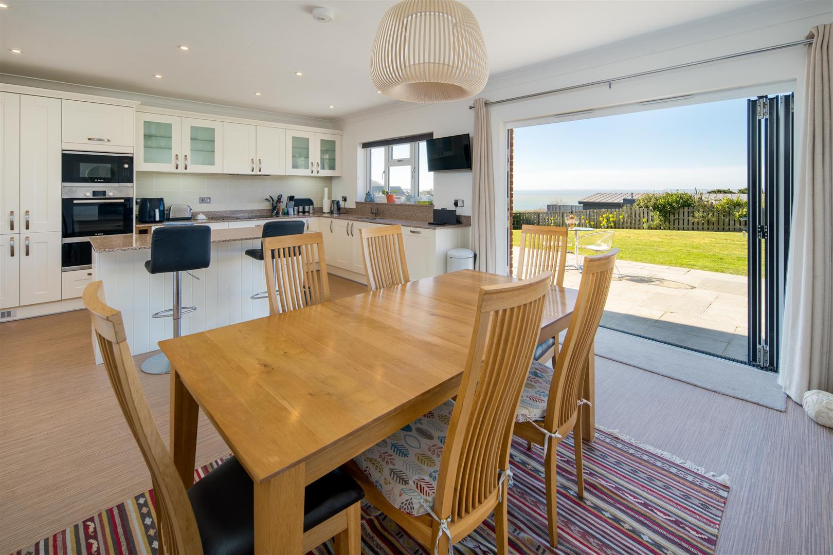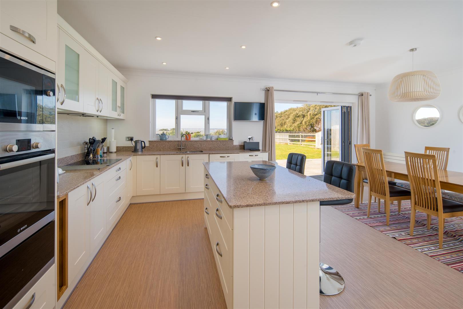 There is a fantastic sized kitchen/diner with sea views and high-quality integrated appliances. The kitchen is well equipped with a good range of wall and base units. Off the kitchen is a well-equipped and large utility room. You can spend time on the patio enjoying the view of the sea or perhaps watching the ‘Round the Island’ race from the comfort of your own home.