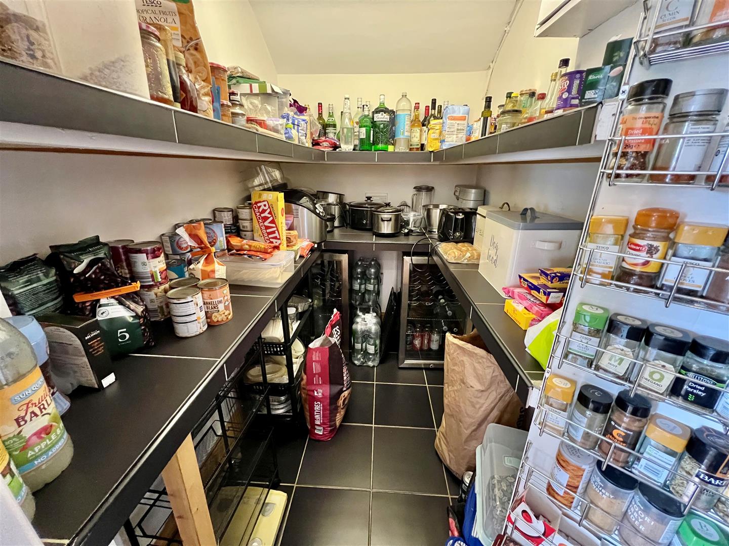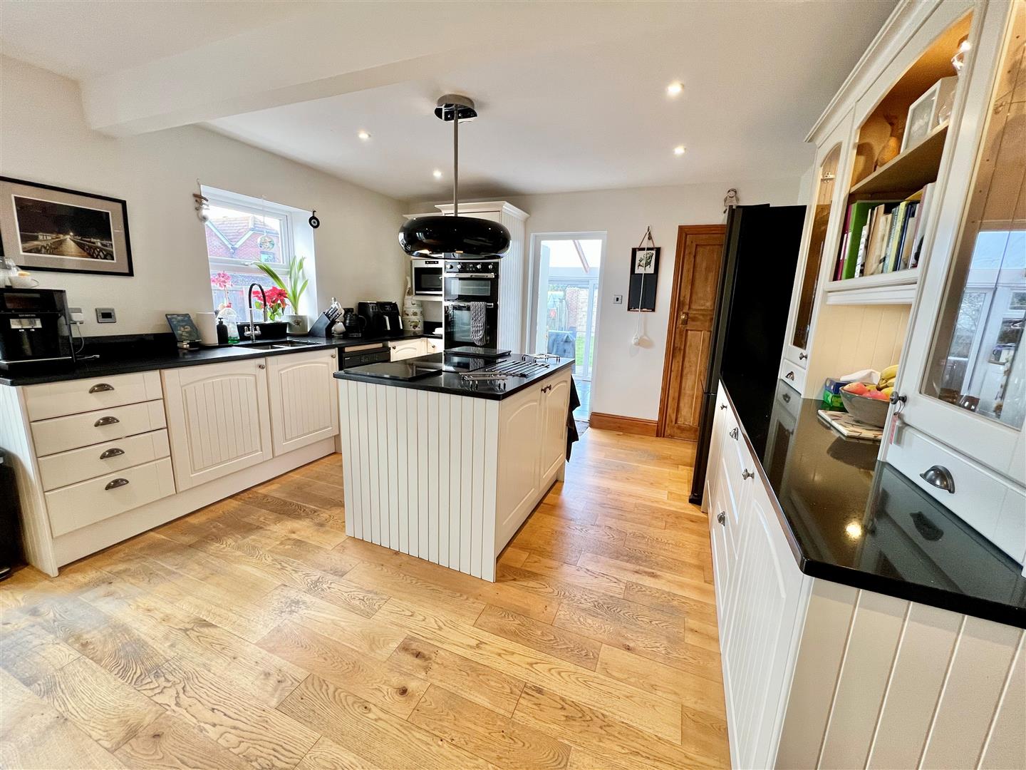 This fabulous open-plan room provides plenty of space for a family dining table, with double doors that open directly onto the garden and a sunny patio terrace. The kitchen is beautifully appointed with modern, tasteful cabinetry, granite worktops, an integrated sink, and an attractive dresser unit. The central island adds further storage and preparation space and features an induction hob with a decorative cooker hood above. Integrated appliances include an electric double oven and a microwave, while there is space for a fridge/freezer and dishwasher too, together with a superb walk-in pantry with tiled shelving offering excellent additional storage.