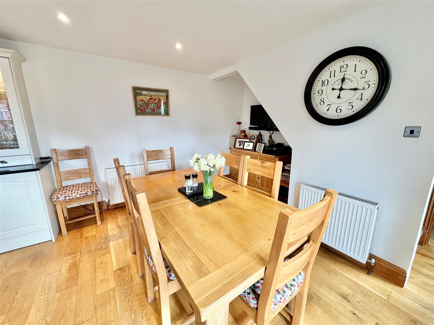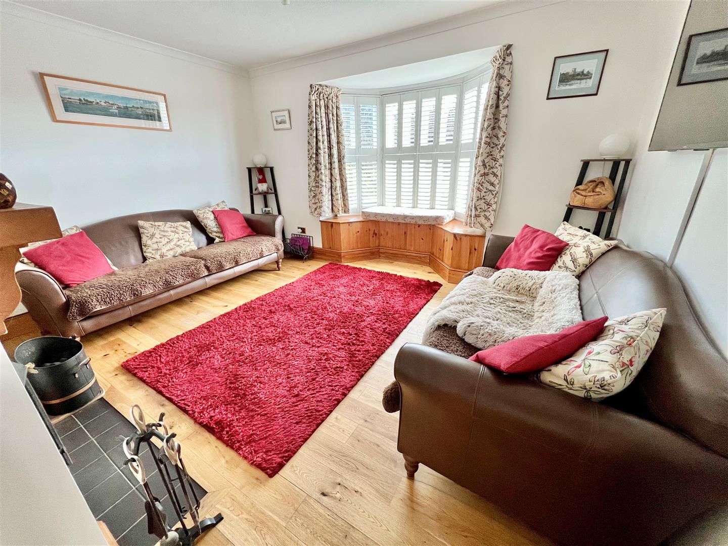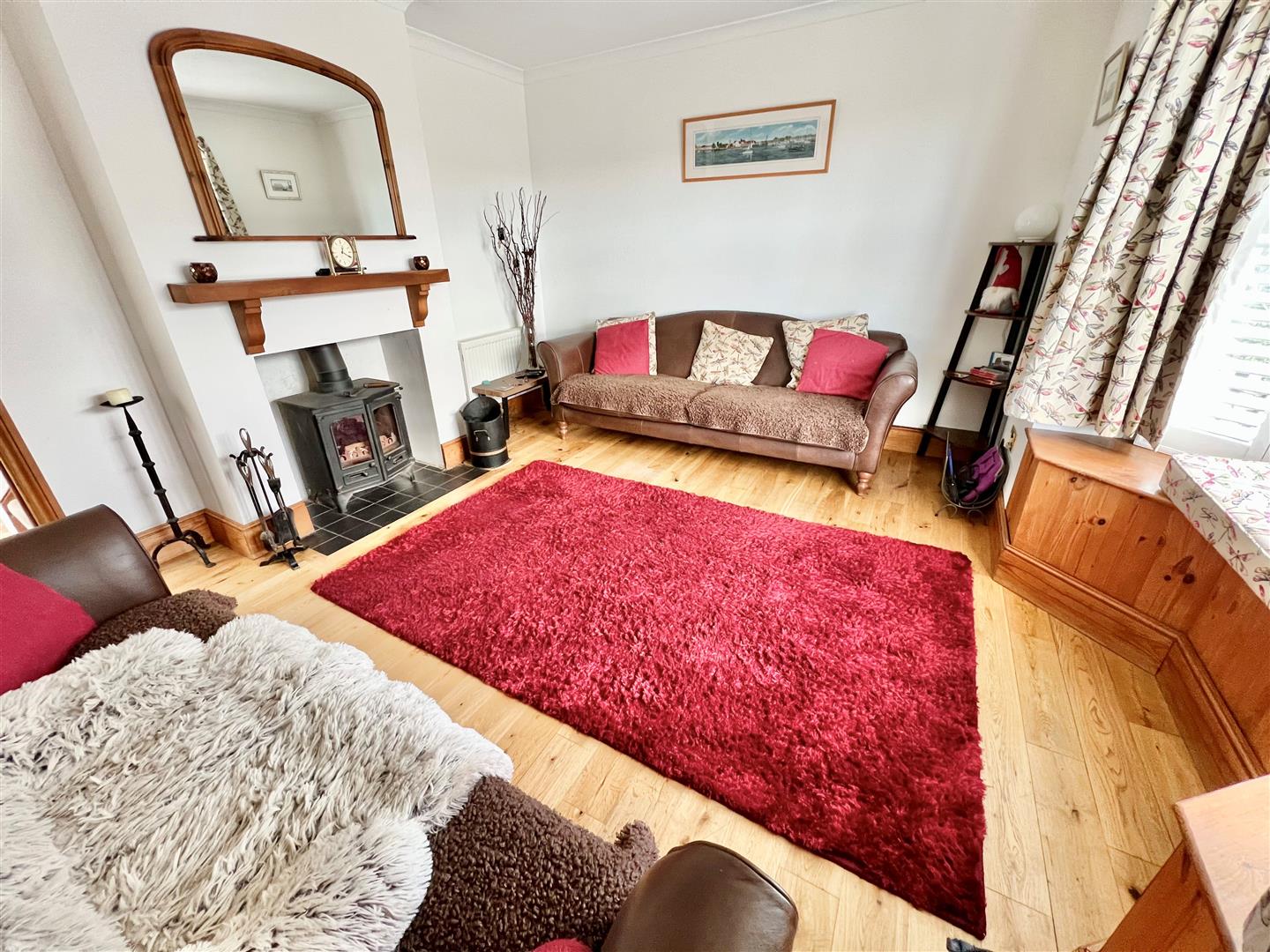 A pleasant reception room with a bay window to the front with fitted plantation shutters and a window seat. A fireplace with fitted multi-fuel stove provides a charming focal point.