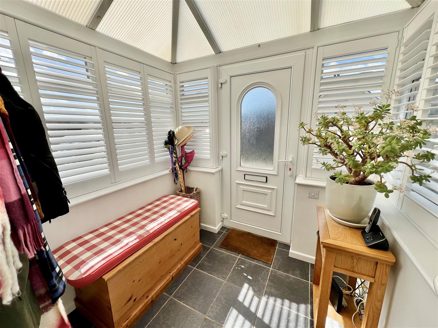 A fabulously bright and welcoming space with ample space for coats and shoes and featuring attractive plantation shutters.