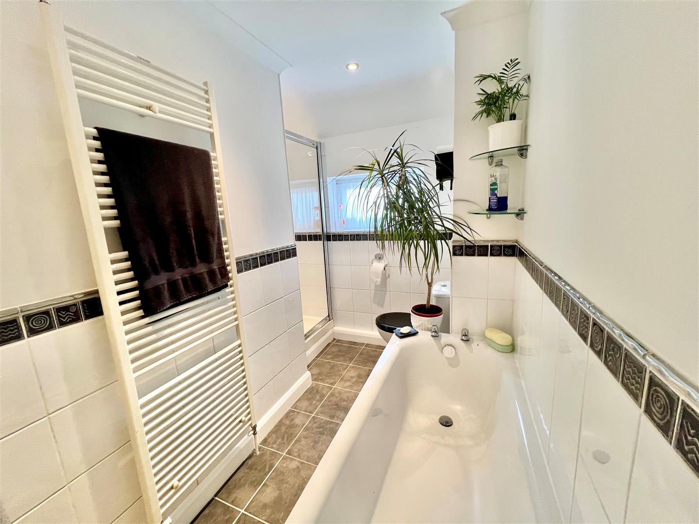 A well fitted facility with suite comprising WC, vanity wash basin, bath and a shower cubicle.