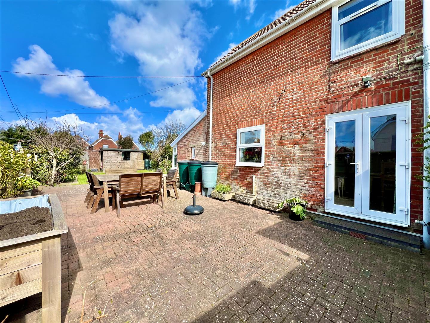 The property has been well maintained and offers practical, well-balanced accommodation suited to modern family living with a mixture of tiled and oak flooring throughout the ground floor. A generous entrance porch sets the tone on arrival, leading into a charming lounge featuring a multi-fuel stove and bay window. The spacious kitchen/dining room is a standout space, with a well-fitted kitchen complete with granite work surfaces, an island unit and a superb shelved walk-in pantry. Double doors from the dining area open directly onto a large patio terrace and the gardens. To the rear, a useful utility/sun room with cloakroom off provides additional everyday convenience and also gives access to the garden. Upstairs, there are three good-sized bedrooms, each enjoying either a downland or sea view/glimpse, along with a family bathroom that includes both a separate shower and a bath. Outside, the property benefits from off-road parking to the front and side, while the enclosed rear garden offers a lawn ideal for play and a generous patio terrace perfect for relaxing or entertaining.