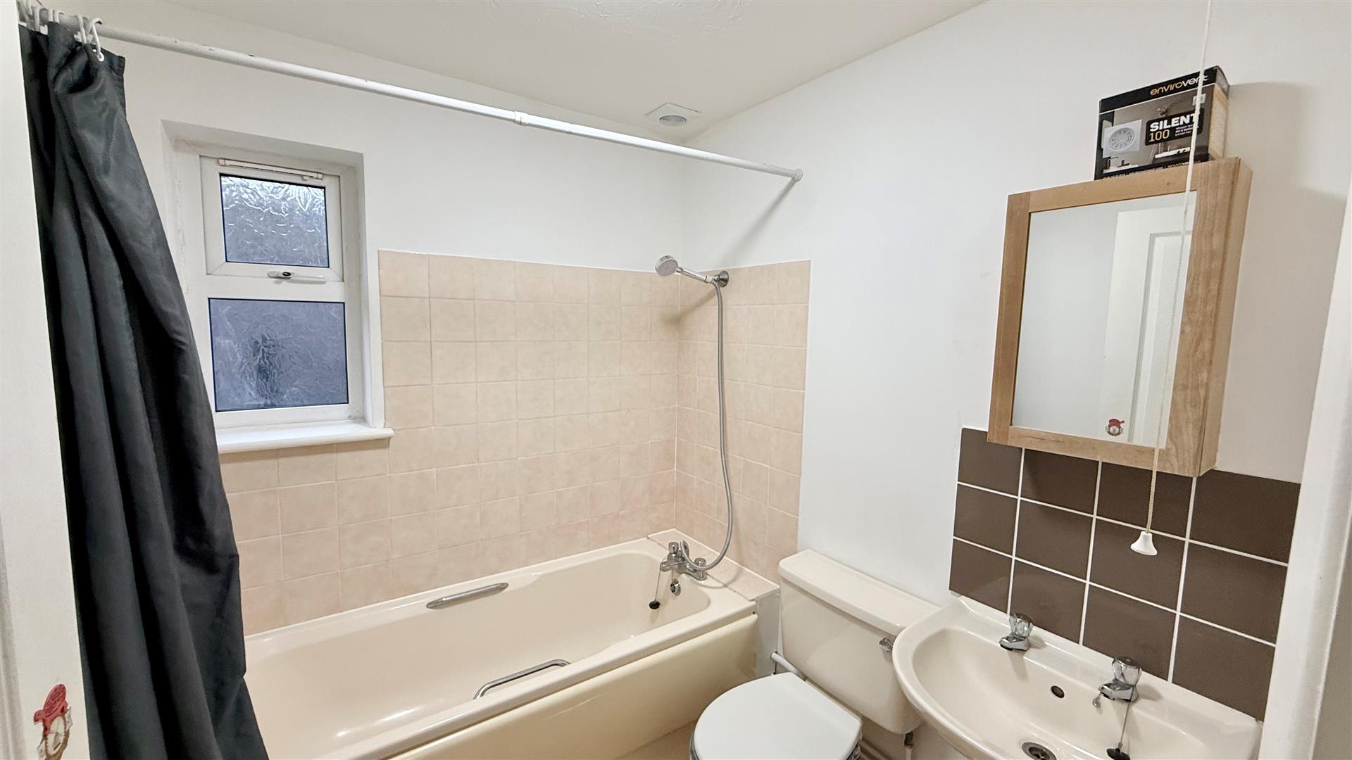Bath with mixer tap and shower attachment, WC and pedestal wash hand basin. Obscure window to side.
