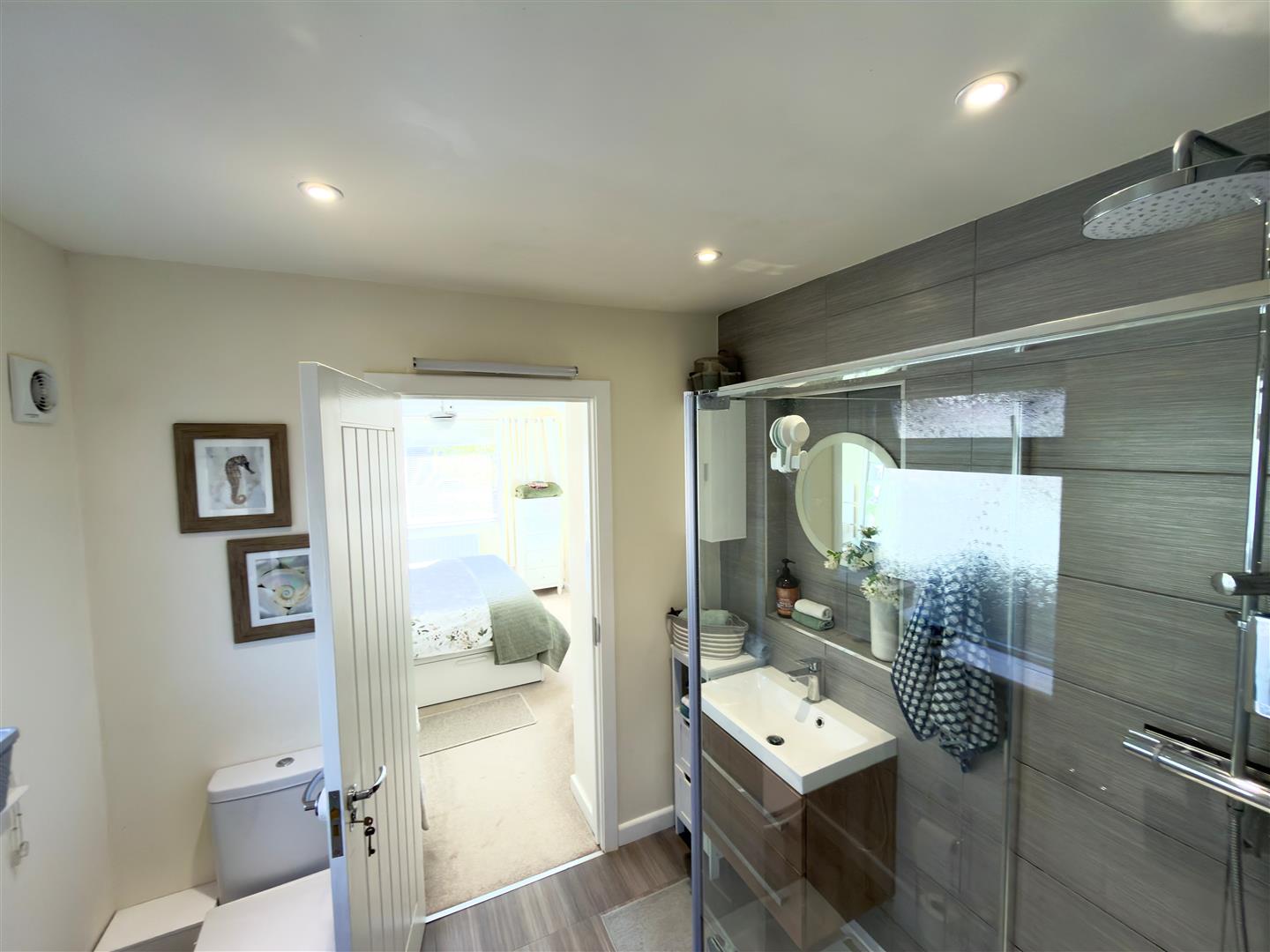 Comprising a shower unit, WC and vanity unit with inset wash hand basin. There is an obscure window to the side and internal door leading into