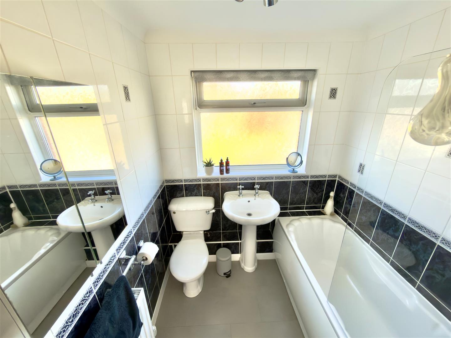 A family bathroom with panelled bath including separate shower over, a WC and a pedestal wash hand basin. Obscure window to rear and built-in storage cupboard.
