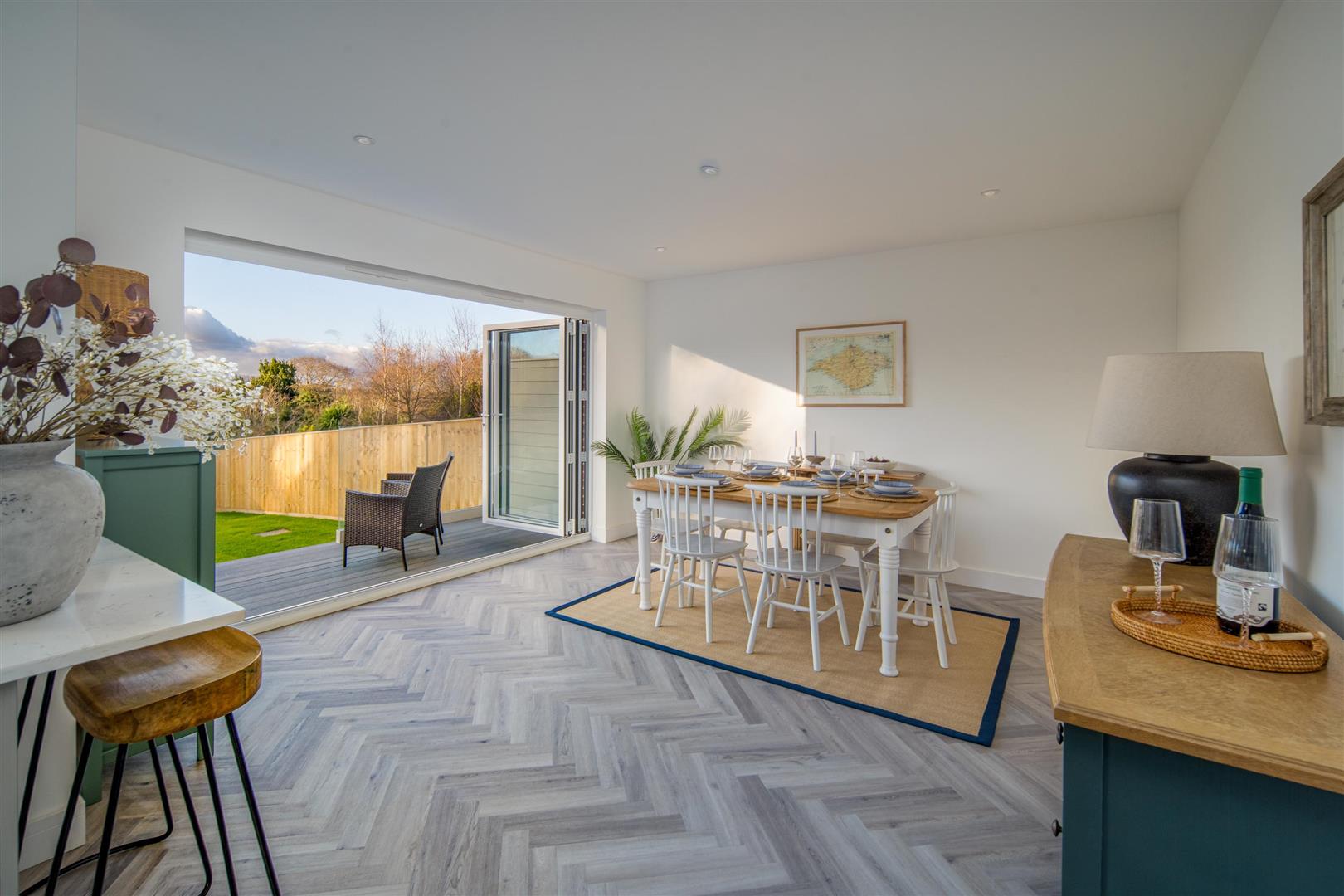 Open Plan Kitchen/Dining Room – An excellent open space with large kitchen offering a generous range of undercounter and wall-mounted storage units, quartz stone worktops with 1.5 bowl undermounted sink with stainless steel instant hot Quooker mixer tap, integrated dishwasher, oven, microwave, induction hob and fridge/freezer. The dining space enjoys a glorious view through bi-folding doors which access the decked terrace offering further space for outdoor dining and entertaining.