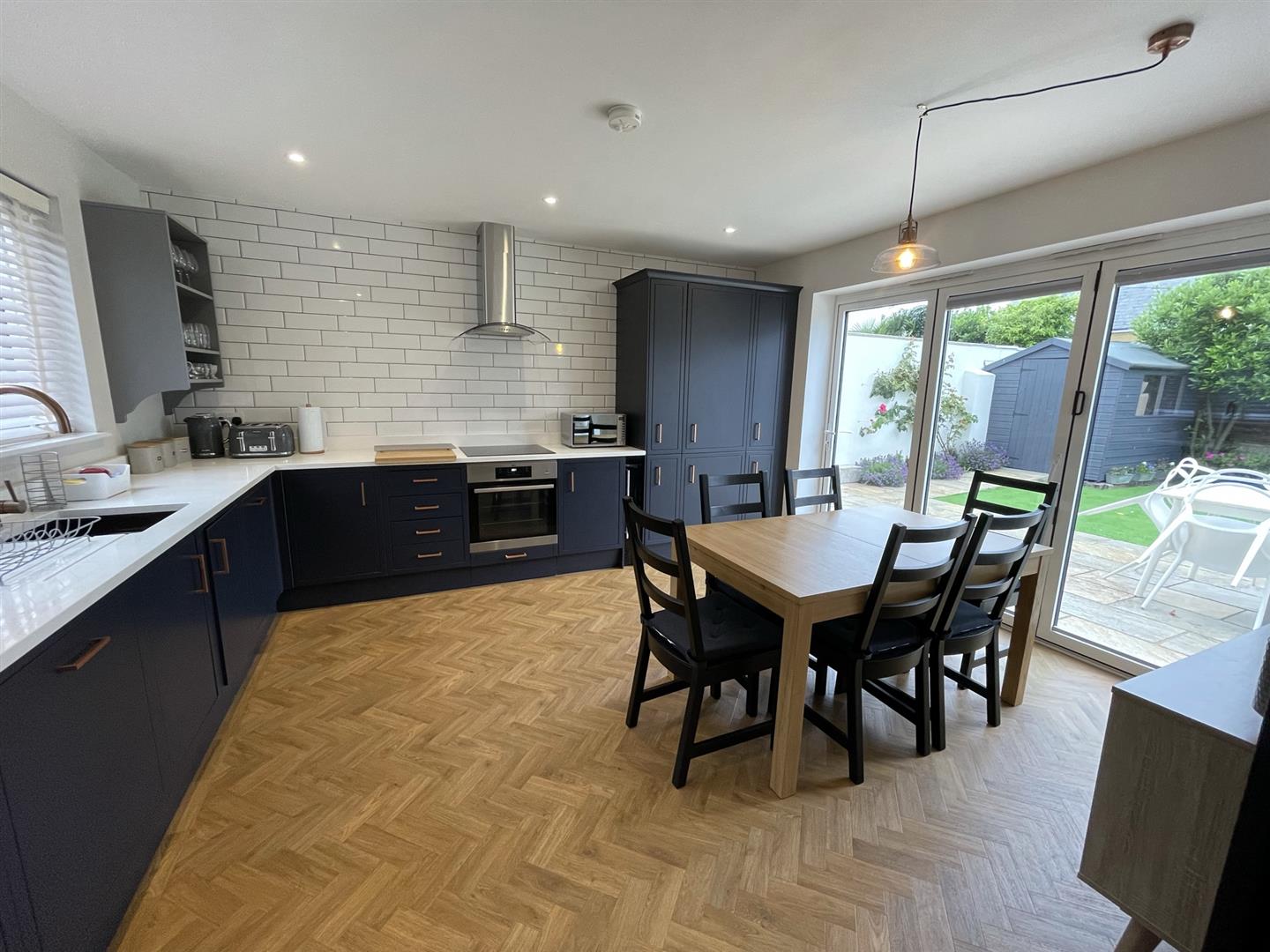 This stylish room has been well-equipped with a full range of under-counter navy blue storage units with white quartz worktops over and a copper effect undermounted sink with mixer tap over. There is a built-in fridge/freezer, wine cooler and AEG oven with an induction hob and extractor over. There is also a built-in dishwasher, washing machine and cupboard housing a Vaillant gas fired boiler. Bi-folding doors offer an excellent outlook to the garden.