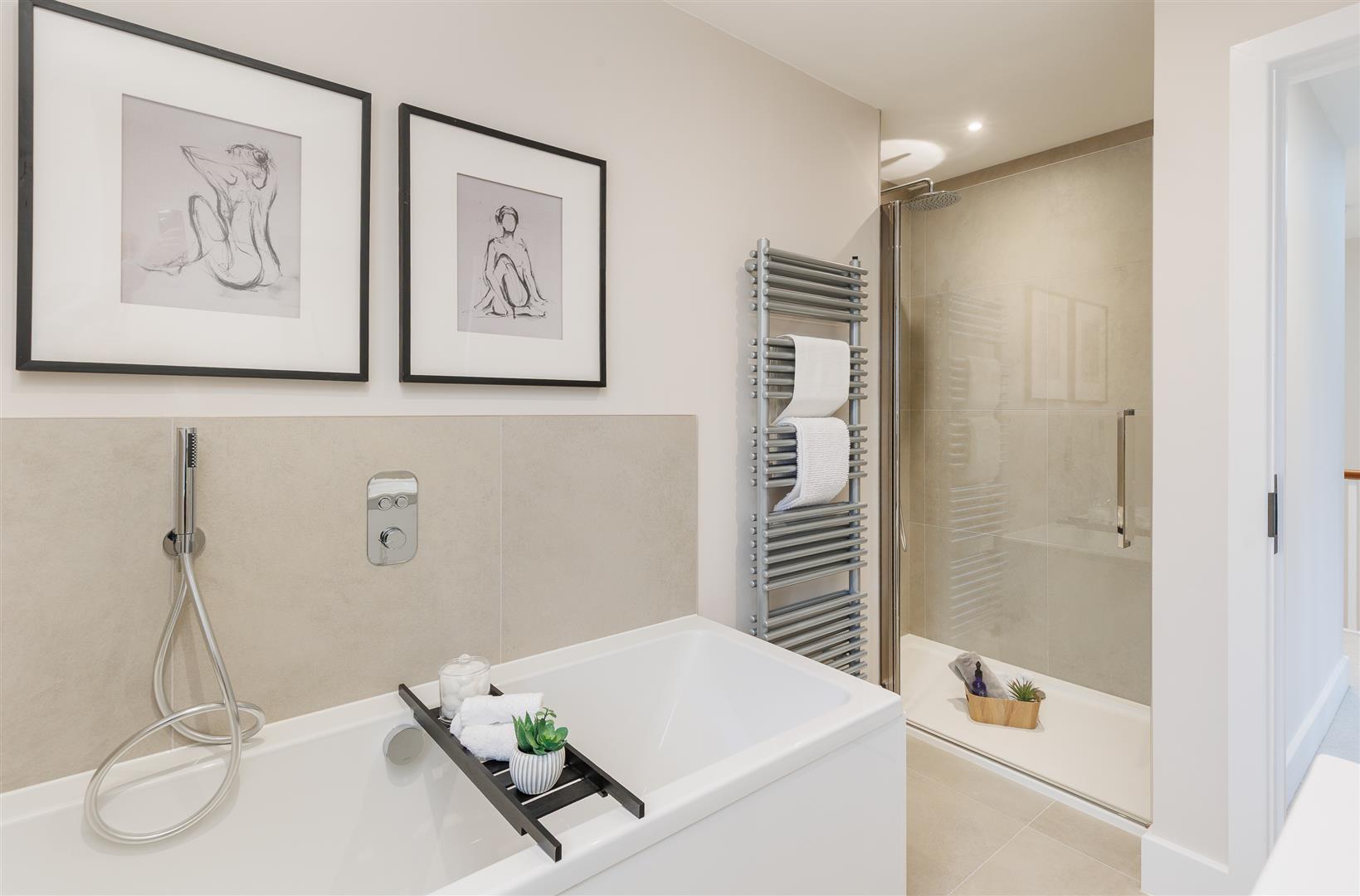FAMILY BATHROOM – Good size bathroom, with large bath, separate walk in shower, wash hand basins sat on vanity unit below WC, heated towel rail and illuminated wall mounted mirror.
