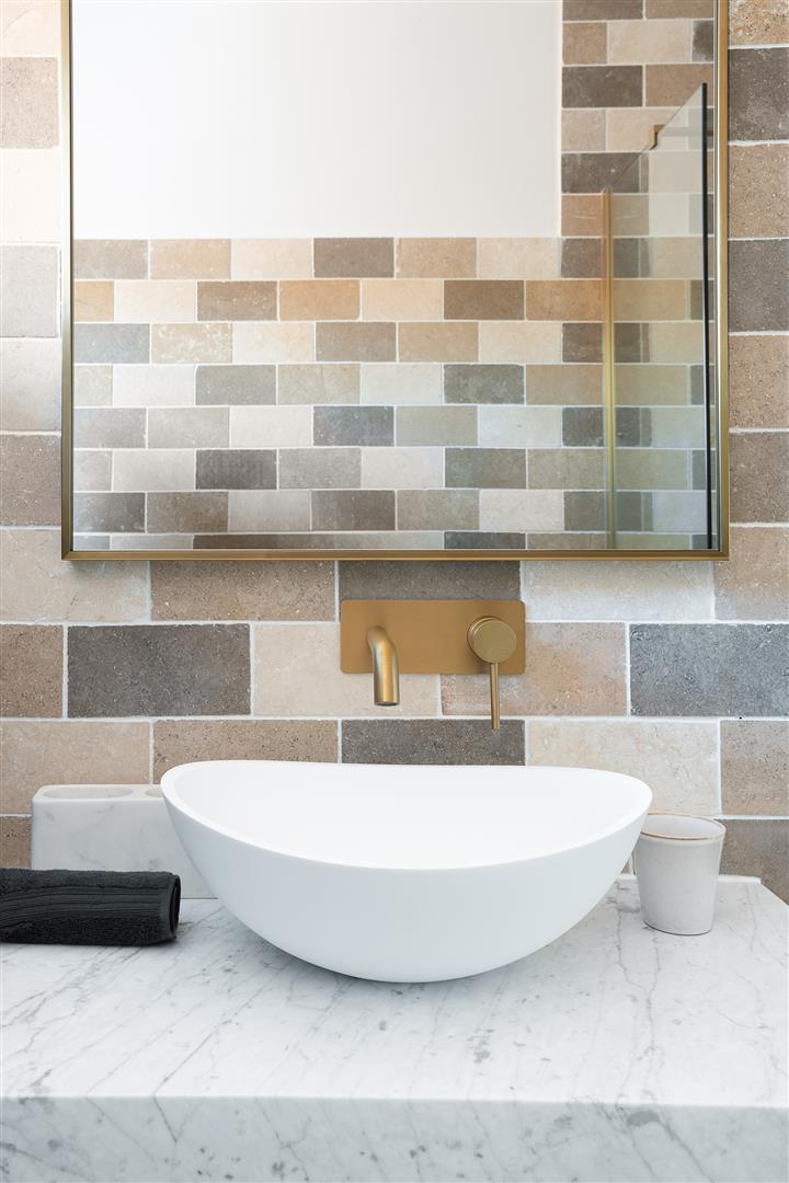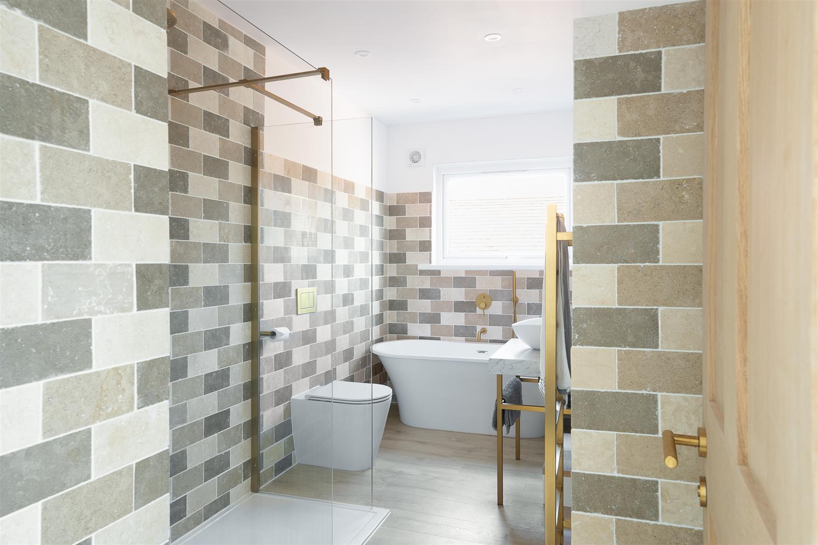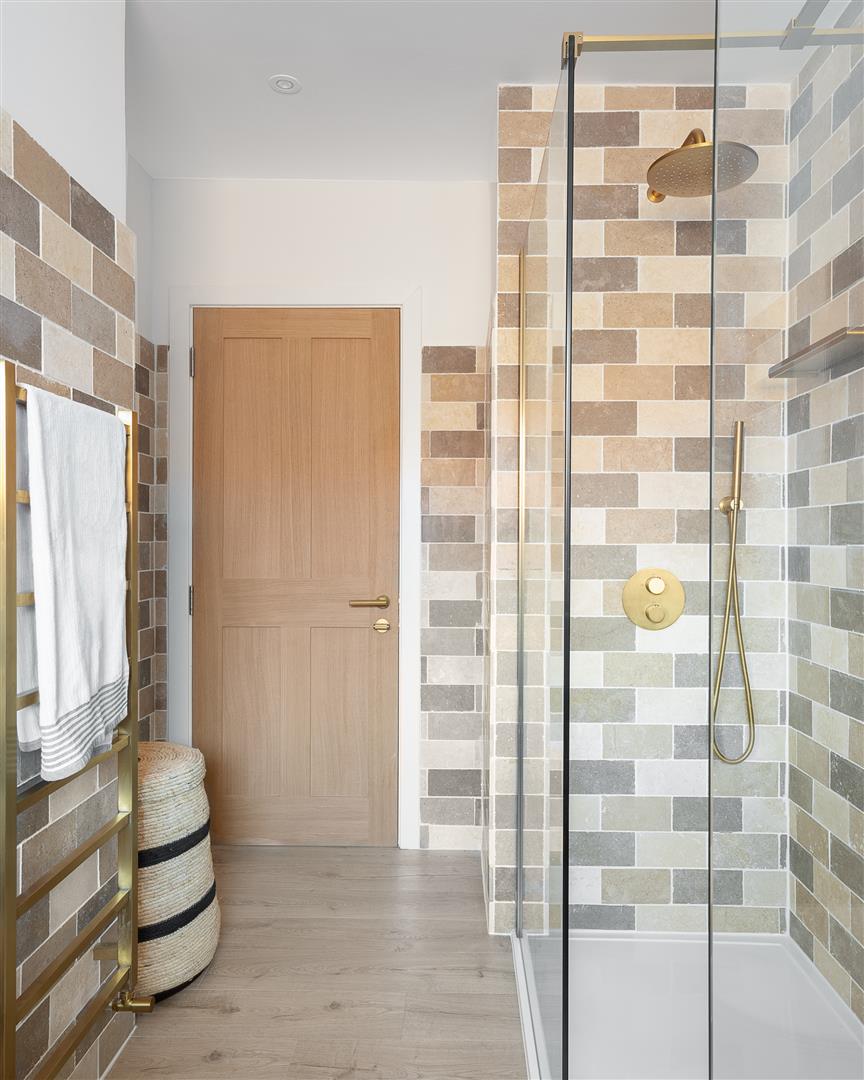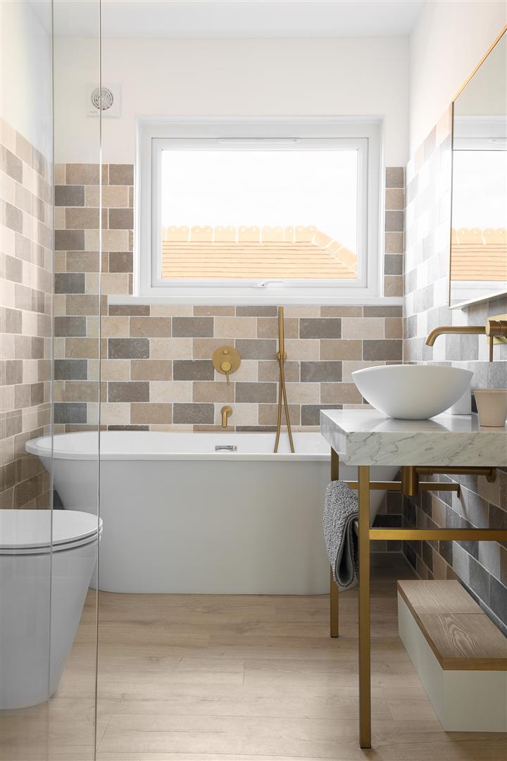 A stunning contemporary suite featuring walk-in shower with matte brass fittings and full tiled splashbacks, a freestanding roll-top bath with shower attachment, a vanity wash basin, heated towel rail, and a concealed cistern W.C.