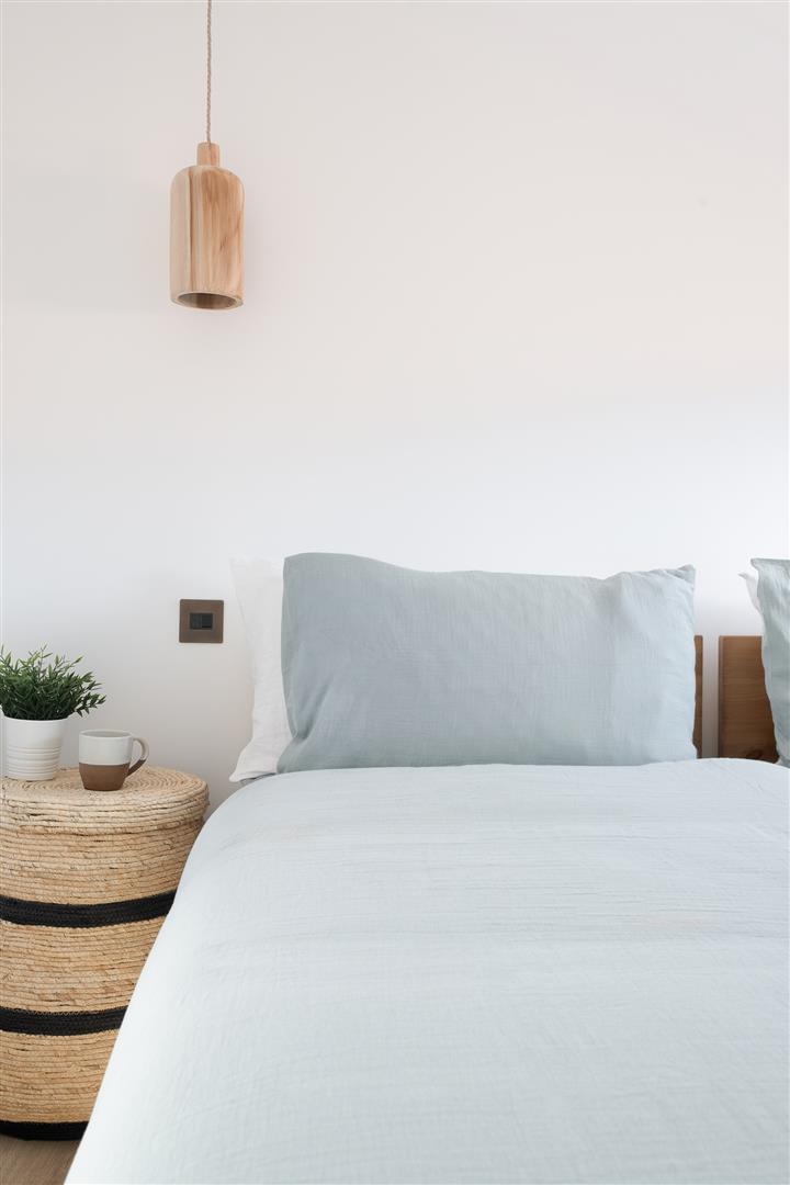 This superb space enjoys triple-aspect windows, including a deep bay window, taking in glorious, far-reaching sea views. The large room accommodates a sitting area and space for a dining table positioned by the front gable window, where the best views can be appreciated. The kitchen comprises a pale sage-green range of under-counter shaker-style storage units with a Corian worktop incorporating a 1.5 bowl undermounted sink, a four ring ceramic hob, and a mid-level oven, microwave, and grill. Integrated fridge and freezer, extractor hood, and a cupboard housing the combination gas boiler complete the kitchen facilities.