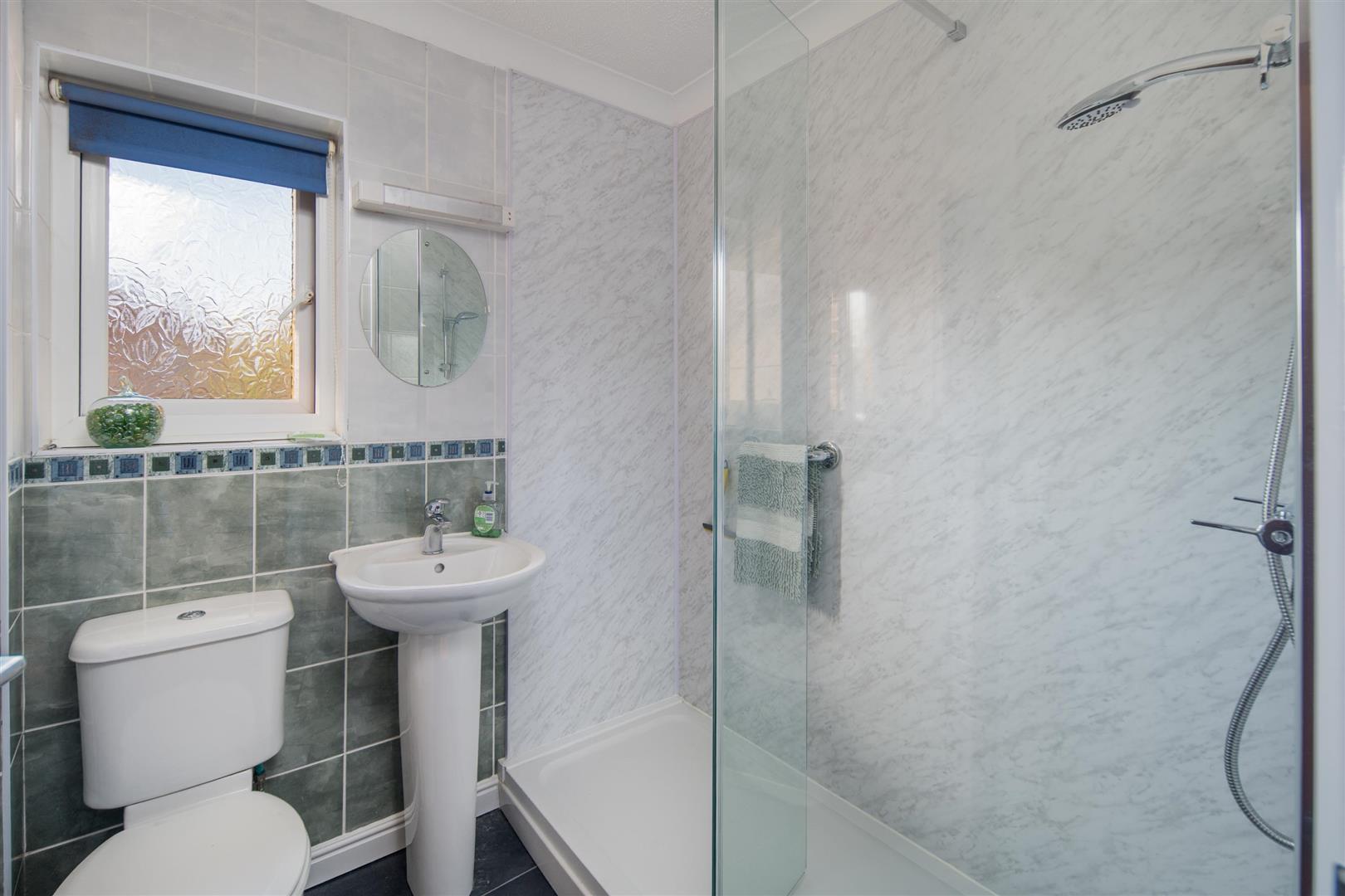 Incorporating a recently fitted walk-in shower, the room features tiled walls and flooring, a pedestal wash basin, heated towel rail, and W.C.