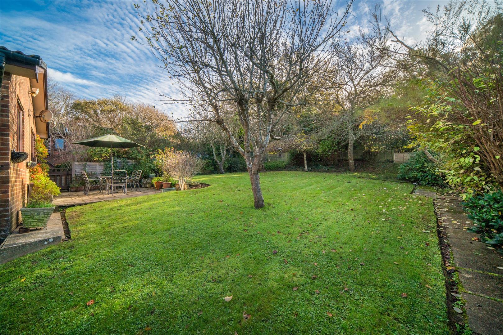 A unique balustrade walkway wraps around the property, offering side access to south-facing, immaculately maintained gardens. Largely laid to lawn, the gardens include established beds planted with a variety of herbaceous shrubs and other plants, along with fruit trees and rare trees including an impressive Canadian Acer. A large patio provides an ideal area for outdoor dining and entertaining. At the foot of the garden, gated access leads to woodland, which offers fantastic walks and links to other areas in Shanklin.