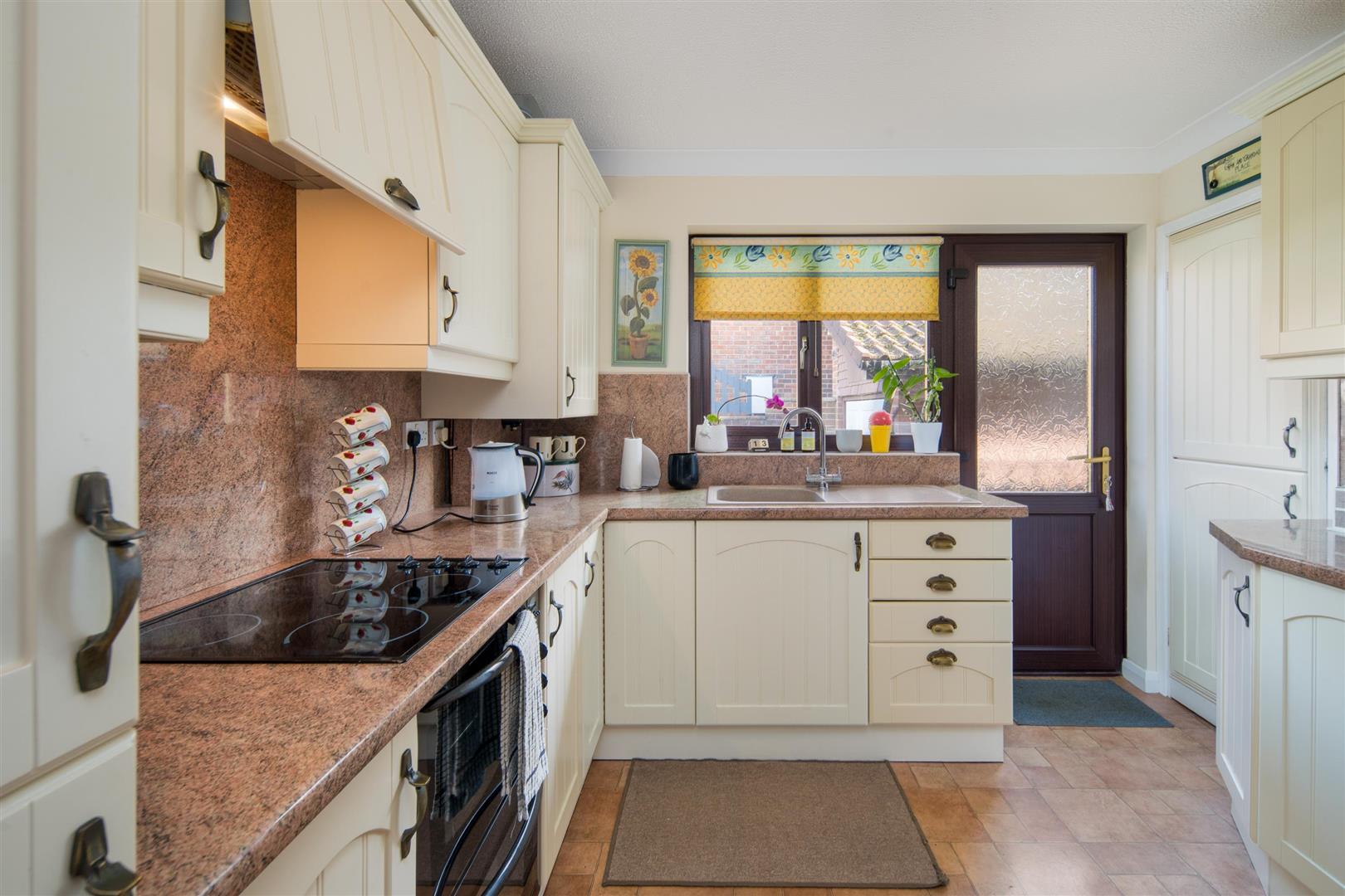 A fully equipped kitchen boasting a range of under-counter and wall-mounted storage units, including an integrated Electrolux oven and grill, plus a ceramic hob. There are wipe-clean splashbacks and a composite washbasin with stainless steel mixer tap. Additional appliances include an integrated fridge freezer, extractor hood, and a newly installed Glow-worm combination boiler. The kitchen also features an InSinkErator waste disposal unit.
