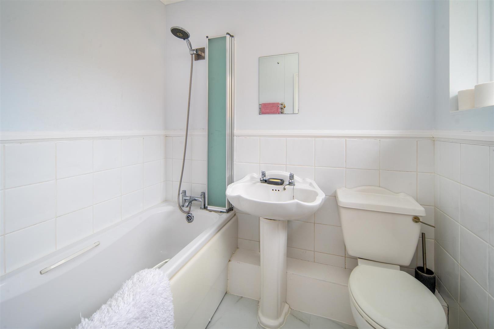 Fitted with a white suite comprising panelled bath with mixer-shower attachment, pedestal wash basin and low-level W.C. Tiled to mid height walls with full tiling to bath area, tiled flooring.