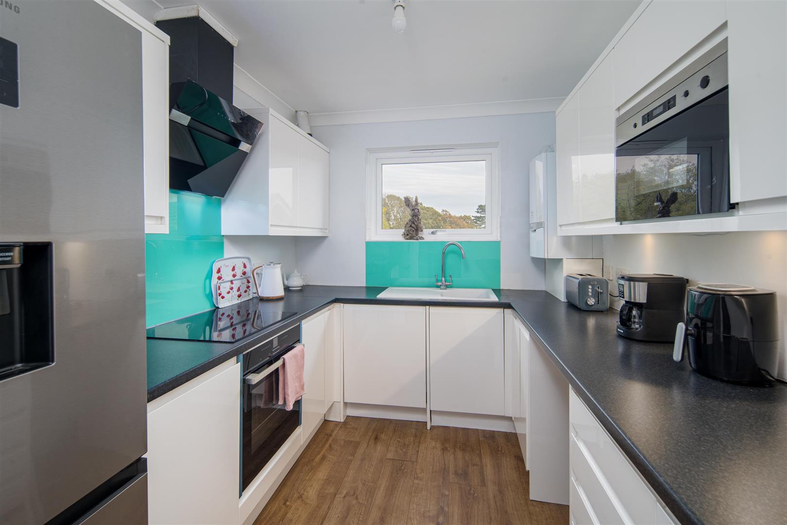 A separate, modern fitted kitchen with a range of white cupboards and drawers beneath contrasting work surfaces. Inset 1½ bowl sink unit, built-in gas hob with oven under and extractor over, integrated fridge/freezer, dishwasher and washing machine. Tiled splashbacks, wall-mounted ‘Biasi’ boiler, and frosted double-glazed window to the side.